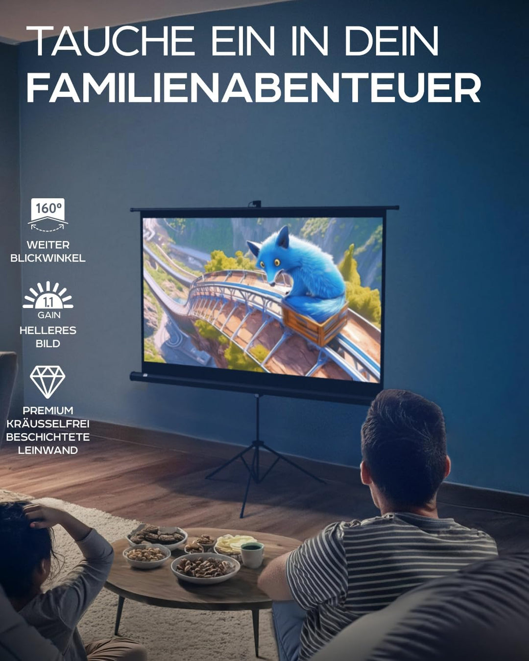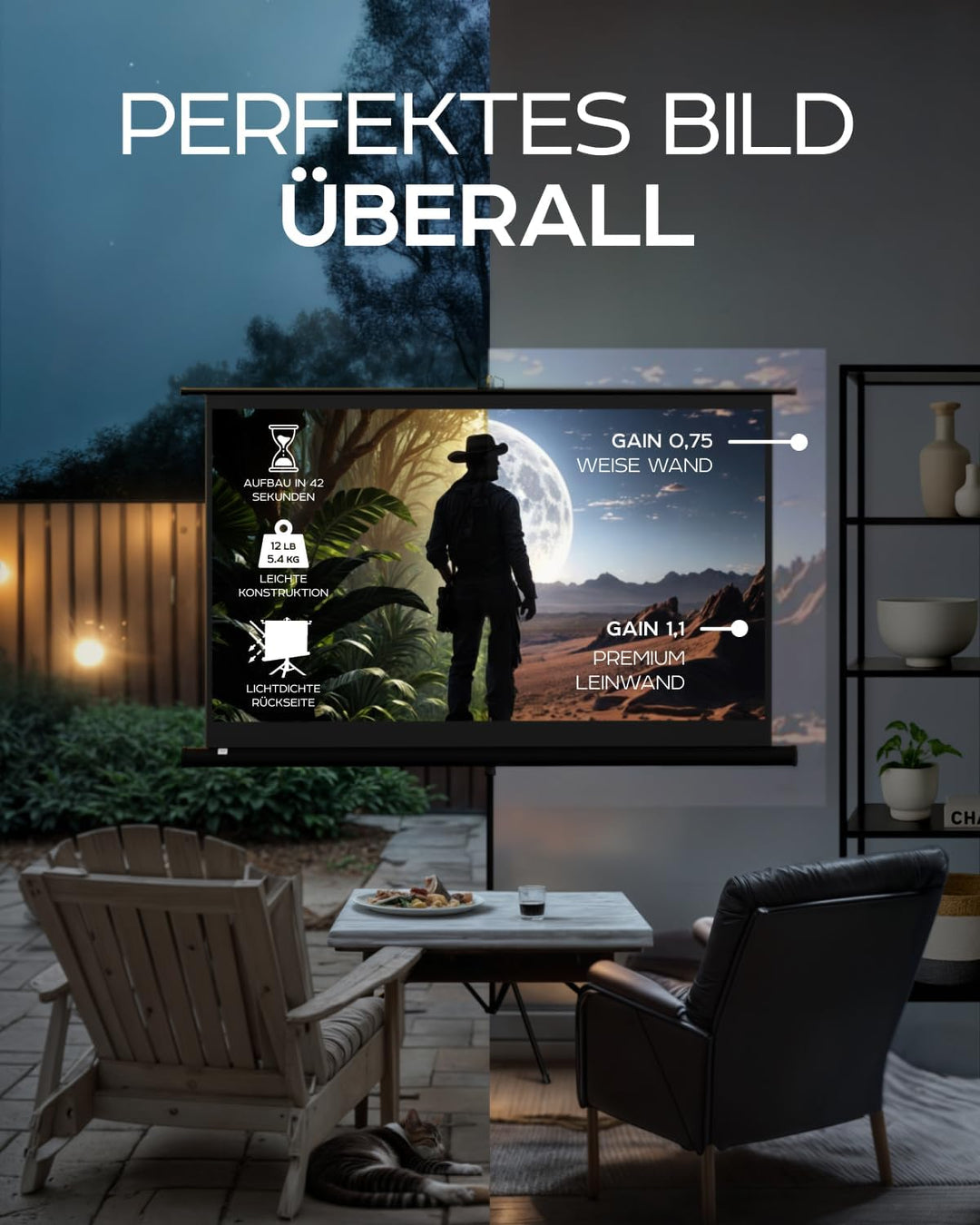 - Die perfekte 16:9 HD Leinwand misst 60 zoll (153 cm) und bietet ein tadelloses Seherlebnis dank Weitwinkel mit 1,1 Verstärkungsreflexion und vielseitiger Höheneinstellung.