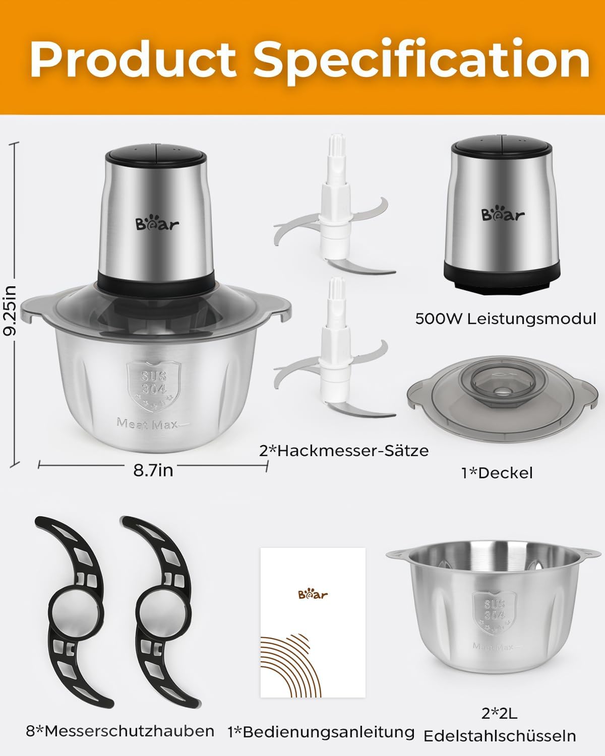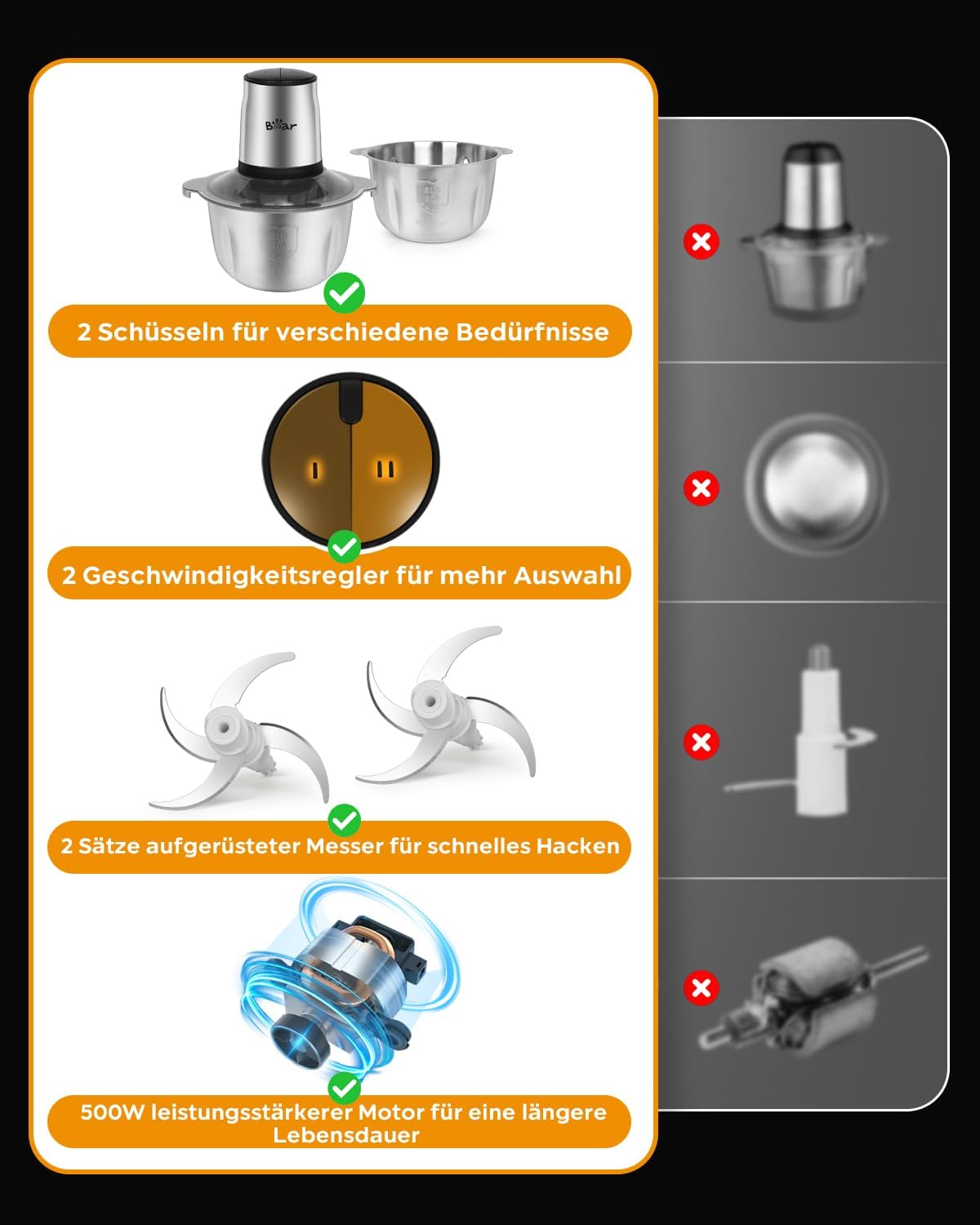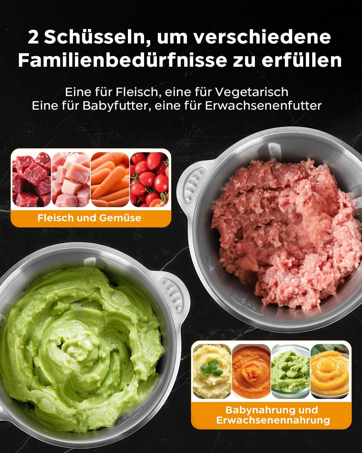 - 👨🏻🍳[2 Schüsseln]1.8L+1.8L, doppelte Tassen/Doppelmesser/Doppeldeckel, scharfe Edelstahlmesser mit Dreischichtstruktur, um verschiedene Bedürfnisse in der Küche zu erfüllen.