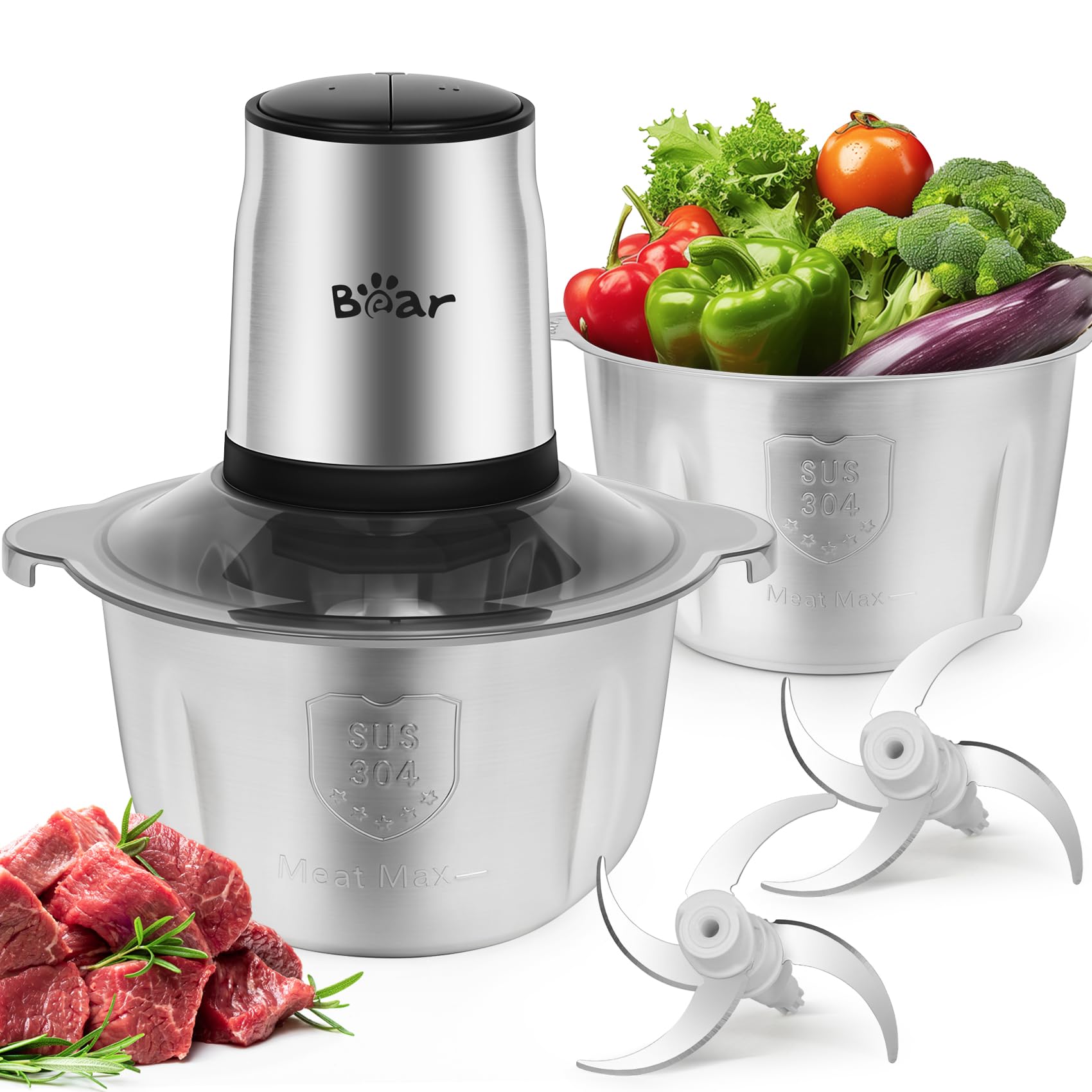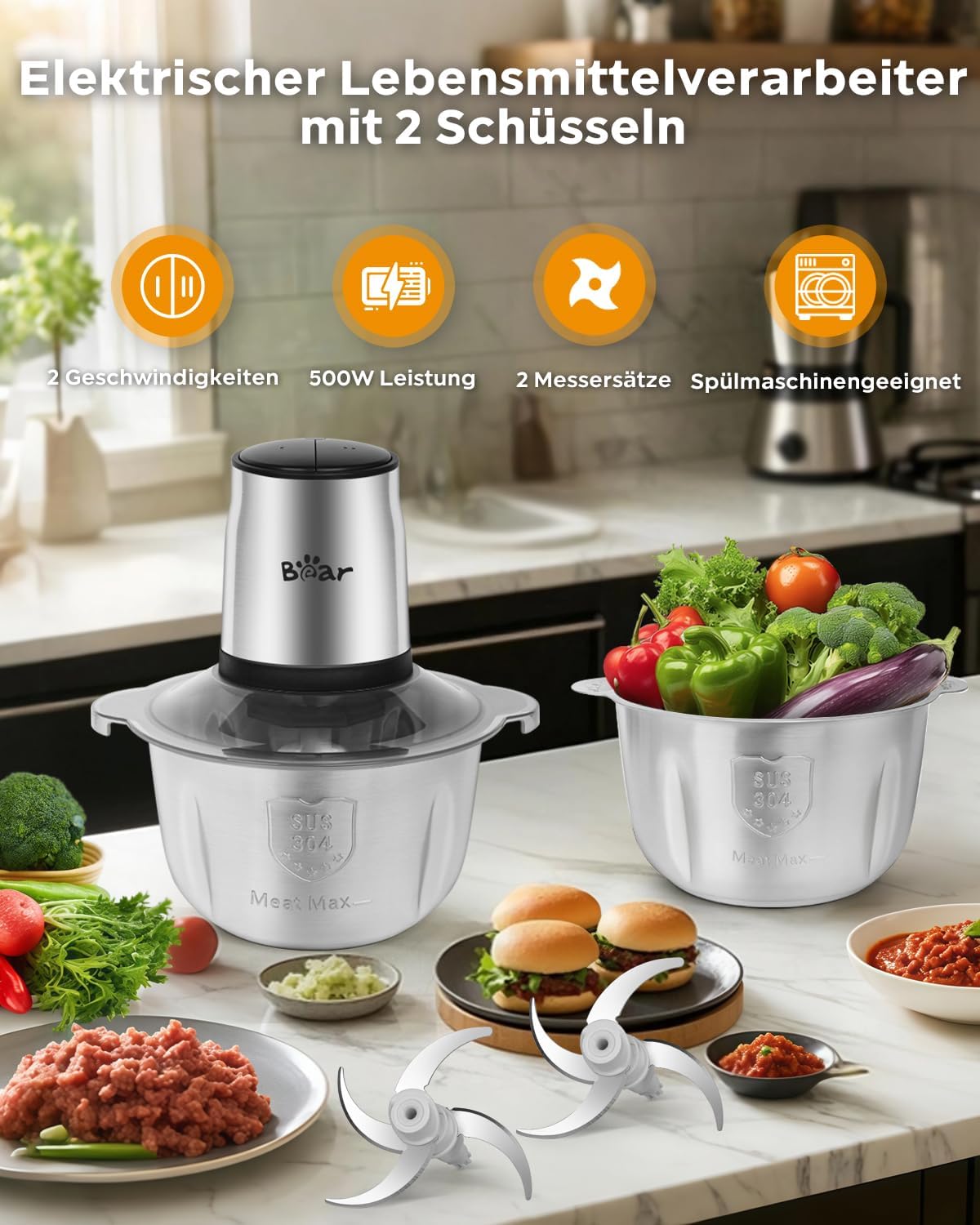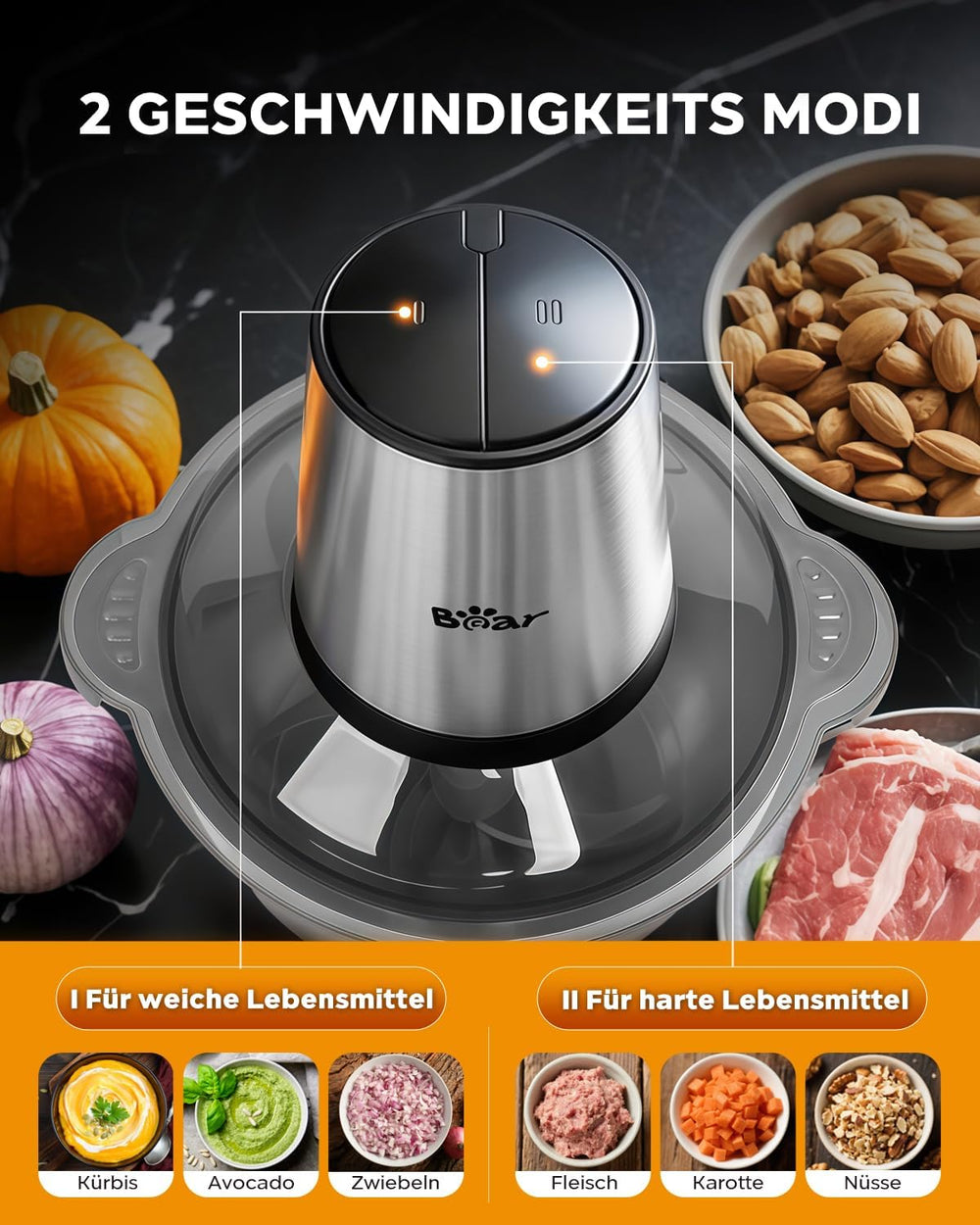 - 💪[2-Gang] Fleischwolf Power 500W zum einfachen Hacken, Schneiden und Mixen einer Vielzahl von Lebensmitteln in kurzer Zeit.Stufe 1 ist für leicht zu hackende Lebensmittel wie Gemüse, Obst, Knoblauch, Chilis, Zwiebeln oder kalte Suppen. Stufe 2 ist