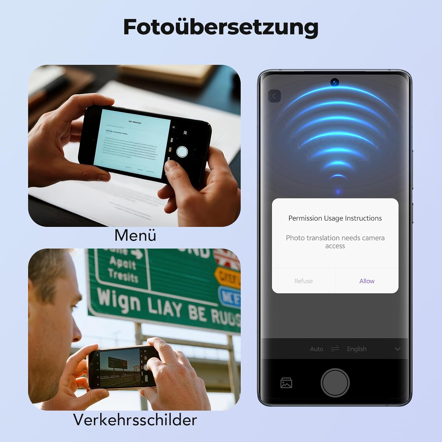 - ✔Flexible Auswahl 7 Übersetzungsmodi : Ein Allrounder für Reisen, Business und den Alltag. Übersetzungsmodi für jede Situation: a.Freisprech-Modus (Echtzeit-Kommunikation) b.Doppel-Ohr-Steuerung (Bedienung per Klick) c.Live-Fotoübersetzung
