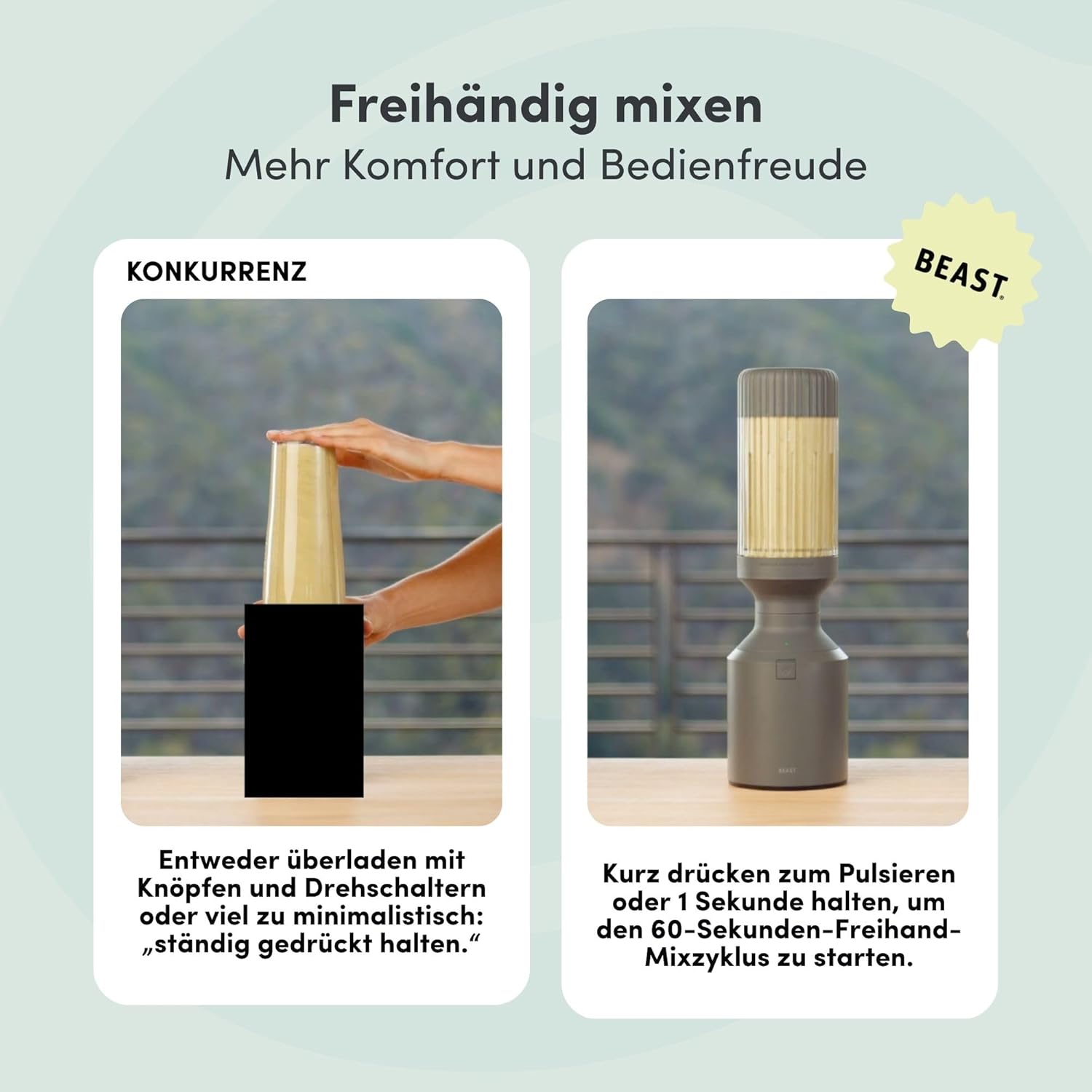 - Kraftvoll & Vielseitig – 850-Watt-Hochleistungsmotor in kompaktem Design, ideal als Smoothie Maker, Proteinshake-Mixer oder zum Nüsse mahlen. Perfekter blender für Smoothies, Shakes, Saucen und Dips.