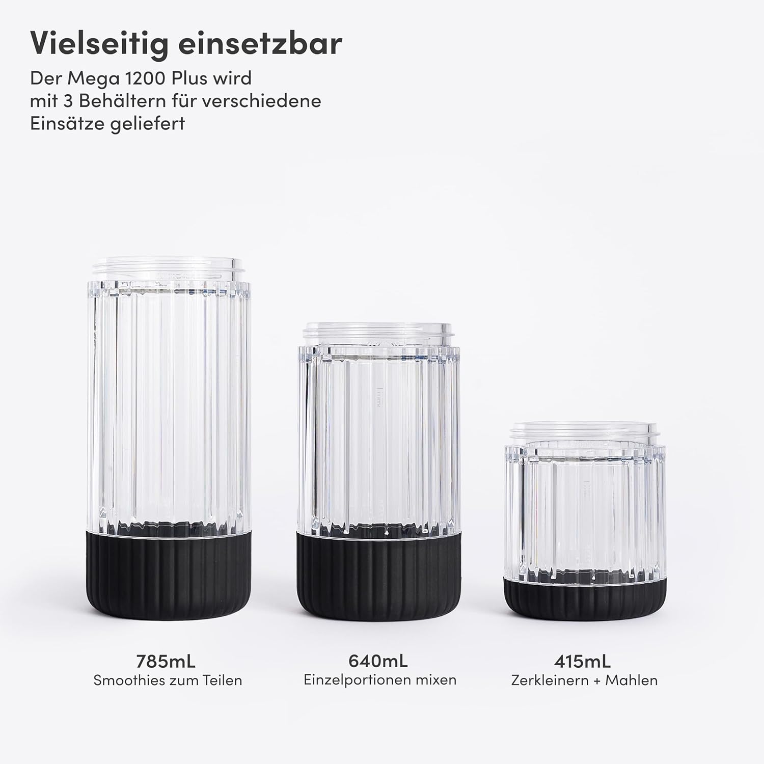 - Hochwertige Materialien – BPA-freier Tritan-Mixbecher (785, 640 und 415 ml) und robuste Edelstahlklingen für präzises Zerkleinern von Obst, Gemüse, Nüssen oder Eis. Für cremige Ergebnisse wie vom Standmixer.