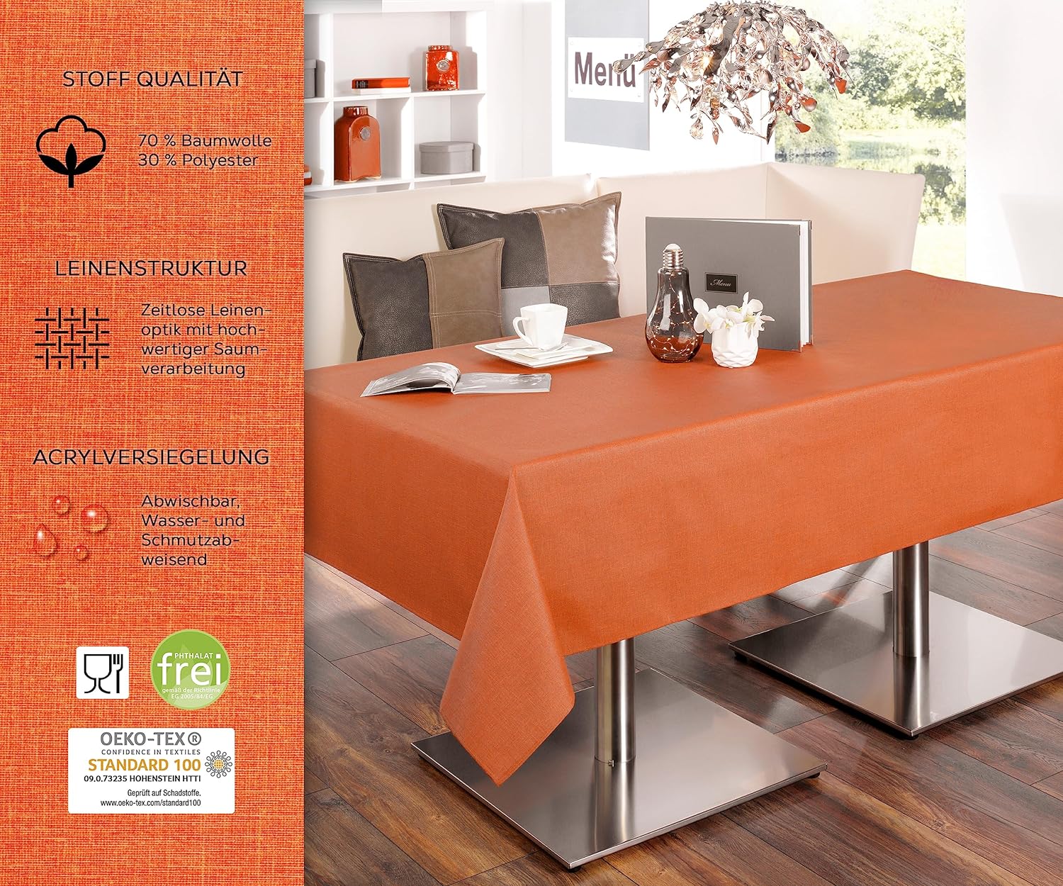 - NACHHALTIG - Textiles Grundgewebe aus 70% Baumwolle und 30% Polyester, Phthalatfrei, Oekotex. Die Oberfläche ist 2-fach versiegelt und erhöht die Lebensdauer der Tafeldecke deutlich