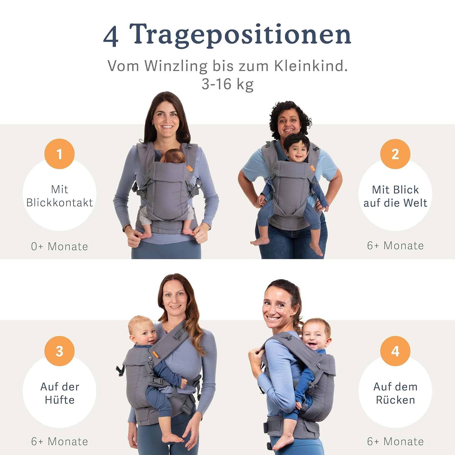 - 4 Tragepositionen: Die multifunktionale Babytrage bietet 4 praktische Tragepositionen für Neugeborene und Kleinkinder. Trage dein Baby mit Blick nach innen oder nach vorne gerichtet, auf der Hüfte oder auf dem Rücken!