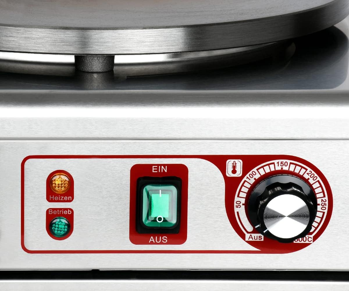 - Temperatur stufenlos regelbar von 50-300 °C, 3000 Watt Leistung, Ein/Aus Kippschalter, Anzeige Leuchten für Status Betrieb oder Heizen - Inkl. gratis Teigverteiler aus Holz