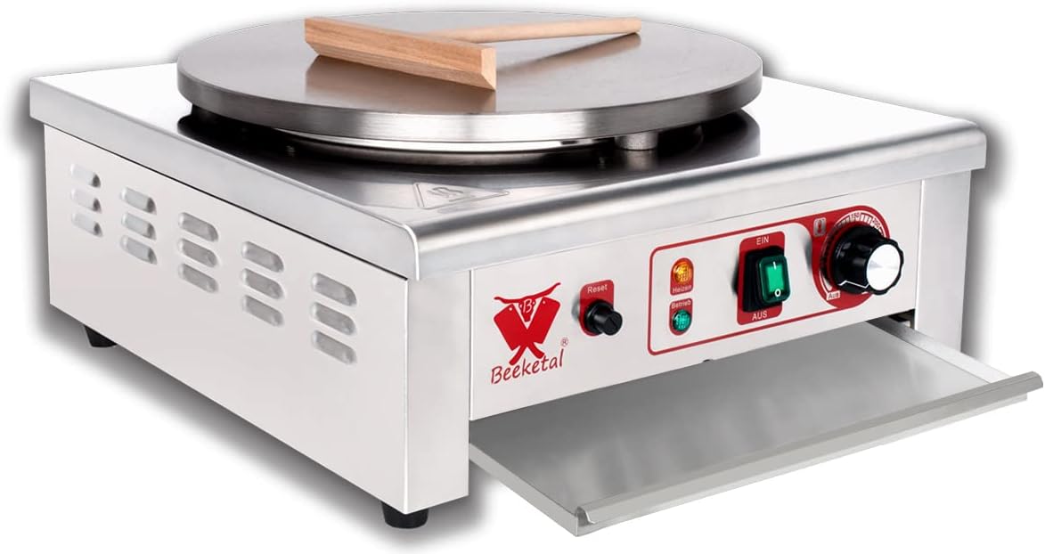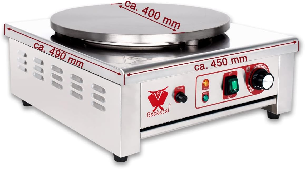 - Beeketal Profi Gastro Crepes Maker BC40-1 mit einer Ø 400 mm Crepesplatte aus poliertem Gusseisen und einem Edelstahl Gehäuse mit extra Aufbewahrungsschublade