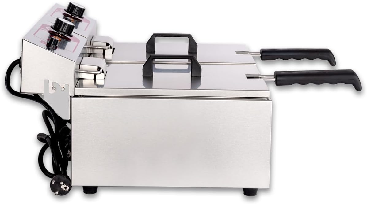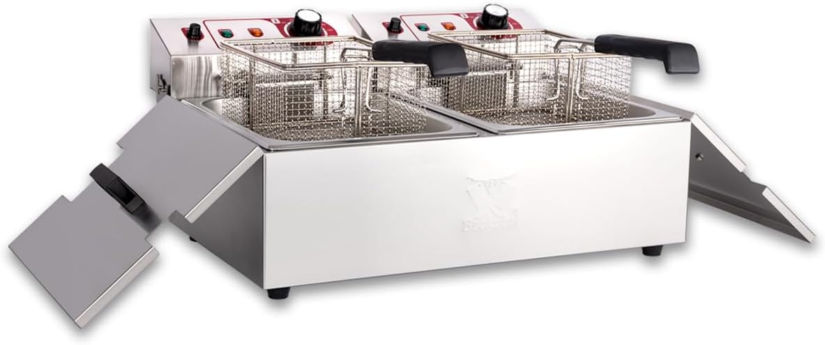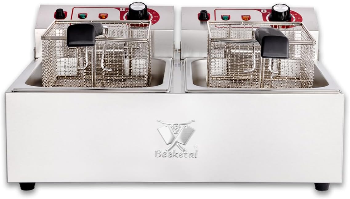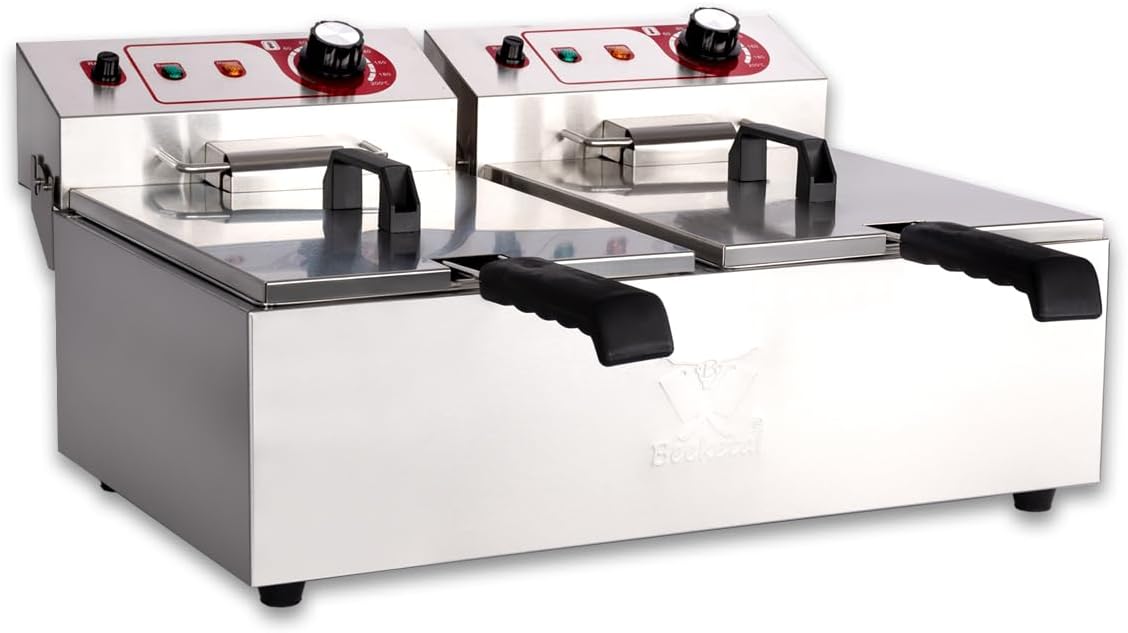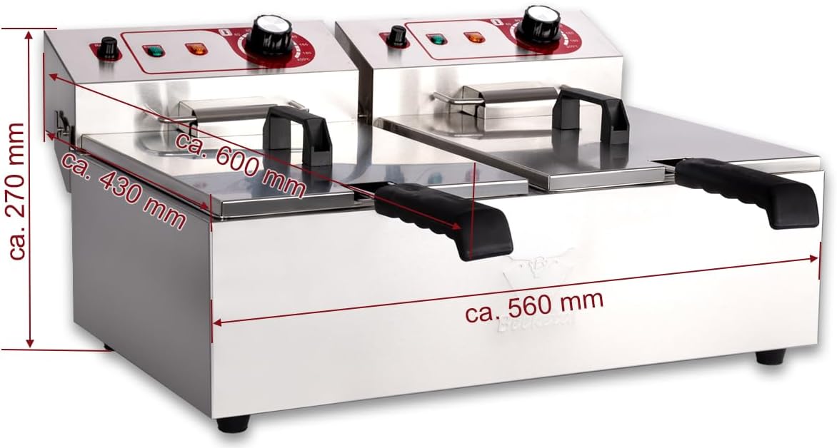 - Beeketal BTF20a - 2 x 9 Liter Edelstahl Doppel Kaltzonenfritteuse inkl. Frittierkörbe und Deckel. Doppelfritteuse mit einem Gesamt-Fassungsvermögen von 2 x 9 Liter für ca. 2 x 5 Liter Öl, ideal für den Hausgebrauch, Imbiss oder Kleingastronomie