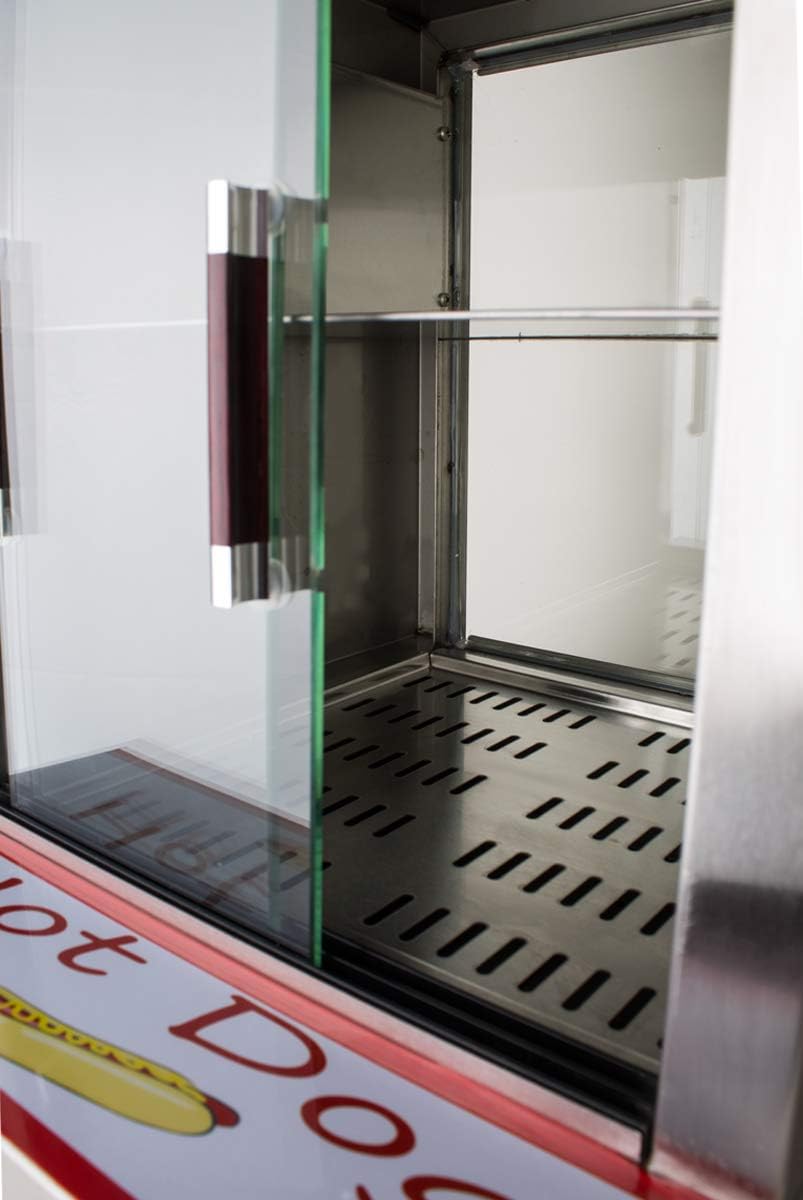 - Elektrischer Hot Dog Maker Wärmeschrank aus Edelstahl mit 2x Glas Schiebetüren, 1x Ablage-Rost für die Würste, 1x Ablage für die Brötchen, Wasserbad Behälter mit 9 Liter Volumen