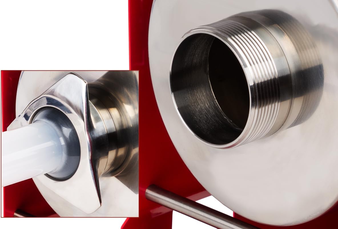 - Lieferumfang: Wurstfüllmaschine (Stahl Gehäuse, rot lackiert), 4 x PVC Fülltüllen (10, 20, 30 und 40 mm Ø), inkl. gratis Zubehör: 2 x Ersatzdichtringe