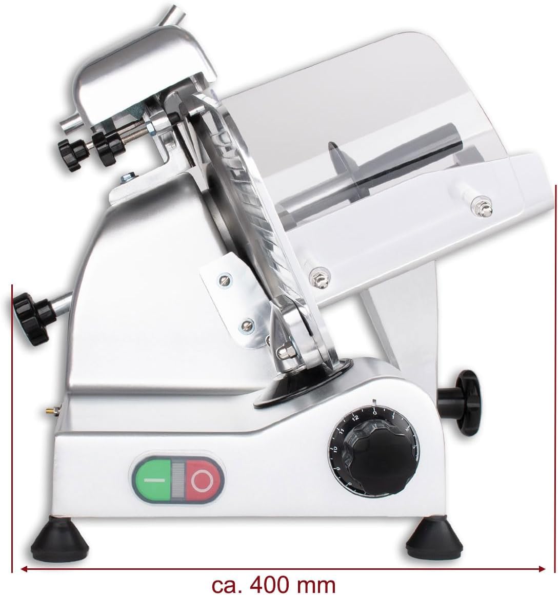 - Elektrische Profi Aufschnittmaschine „Profi 220“ mit 220 mm hartverchromten Spezialmesser, glatter Schneide und Hohlschliff - Extra schwere Gastro Ausführung mit Gehäuse komplett aus eloxiertem Aluminium