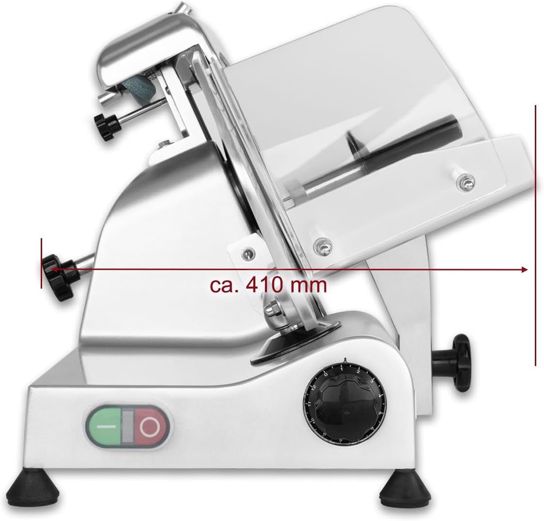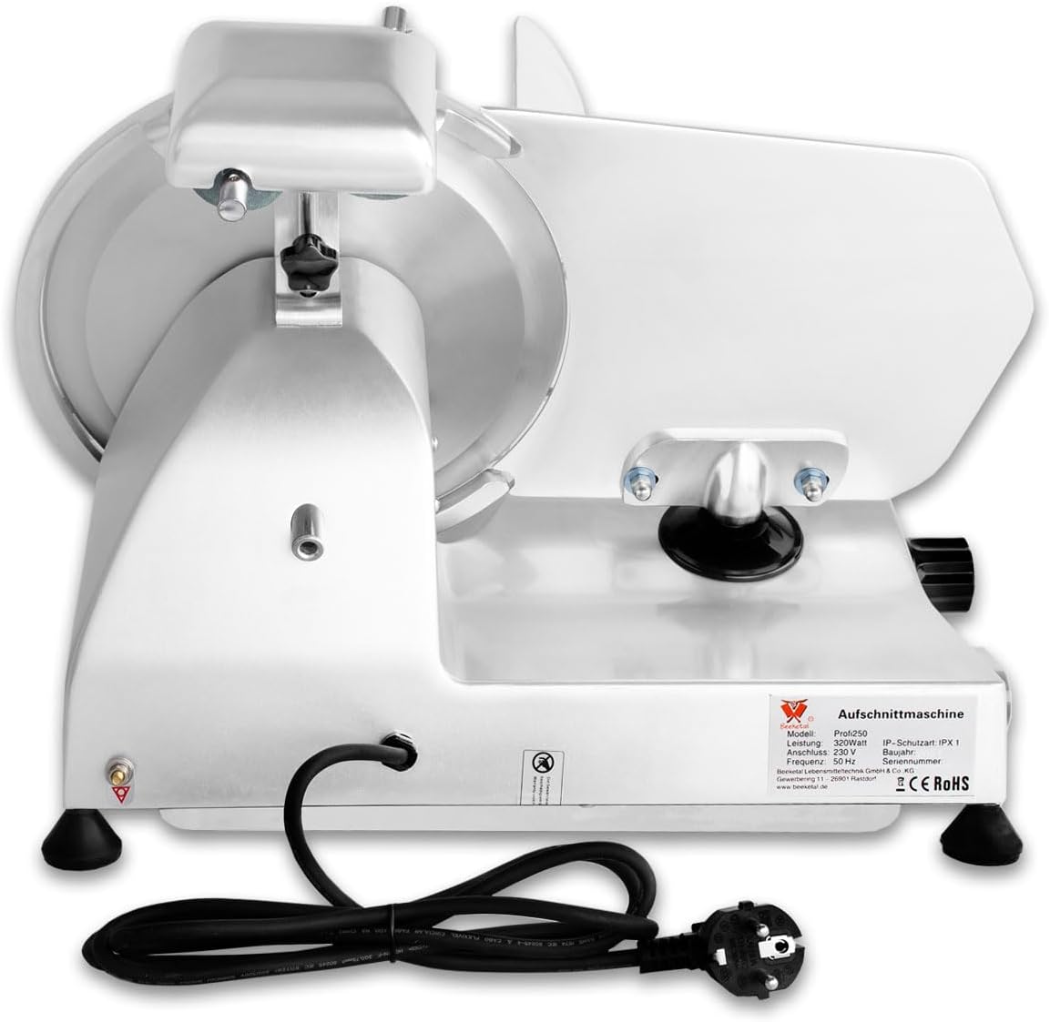 - Elektrische Profi Aufschnittmaschine „Profi 250“ mit 250 mm hartverchromten Spezialmesser, glatter Schneide und Hohlschliff - Extra schwere Gastro Ausführung mit Gehäuse komplett aus eloxiertem Aluminium