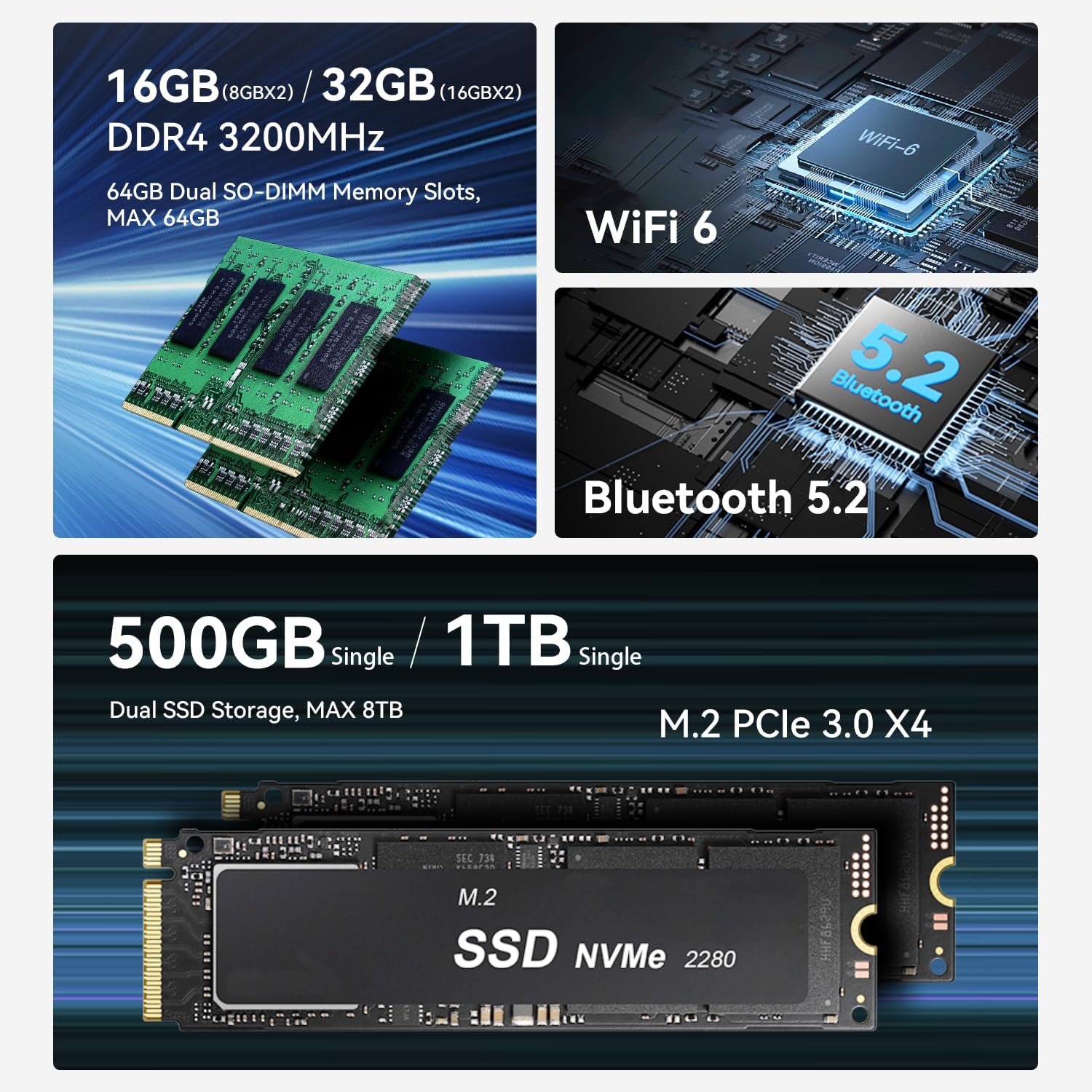 - ⚡【Hohe Speicherkapazität】Beelink 5650U kommt mit 16G DDR4 3200MHz(aufrüstbar auf 64GB, 2x32G), und 500GB M.2 2280 PCIe3.0 SSD(aufrüstbar auf max 2TB für jeden M.2 PCIe3.0 Slot).
