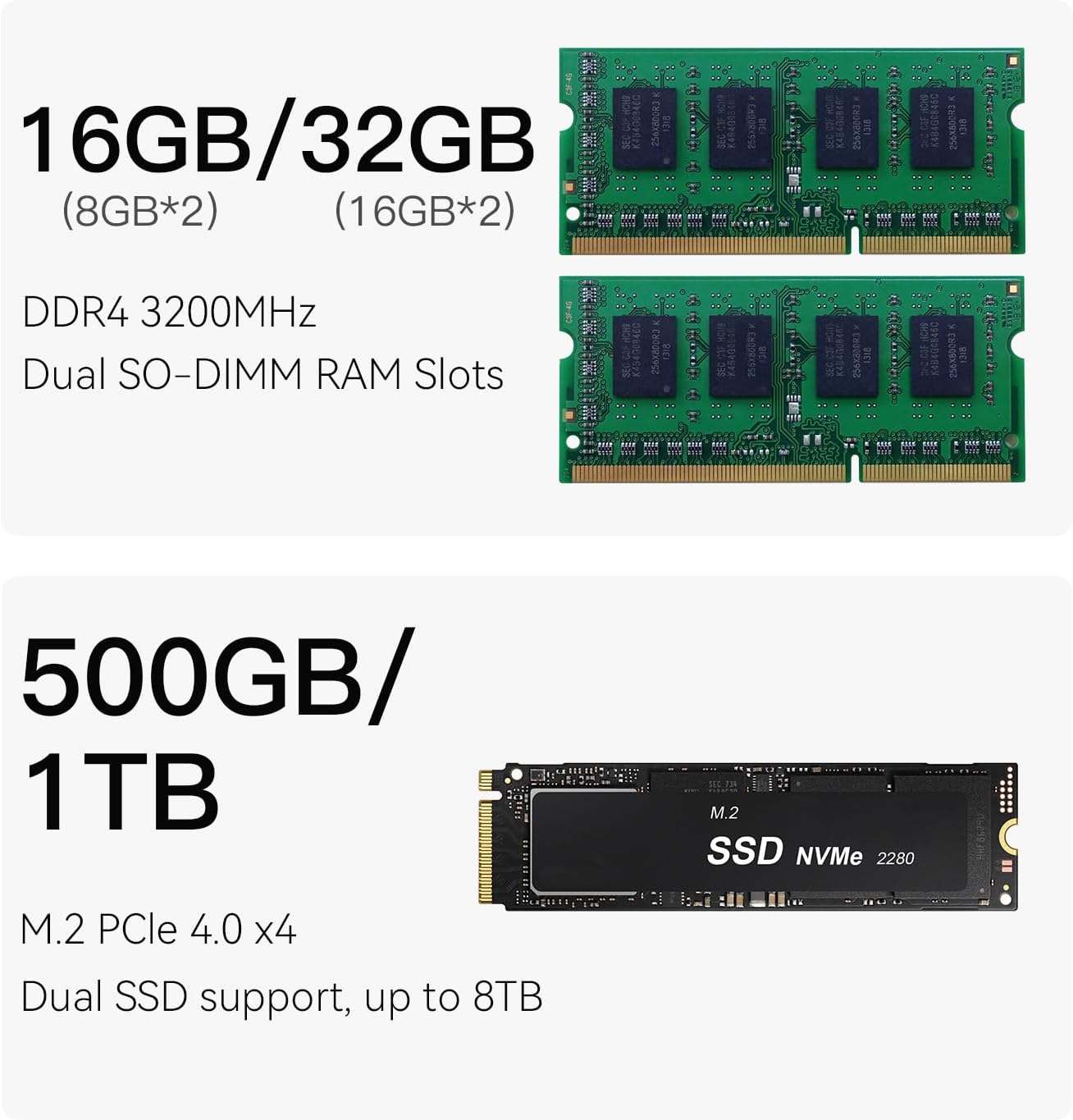 • 🚀【Interne Speichererweiterung】Beelink Mini Computer ist mit 16GB DDR4 RAM und 500GB M.2 PCIe4.0x4 SSD ausgestattet. Er verfĂŒgt ĂŒber zwei M.2 NVMe SSD-SteckplĂ€tze, die bis zu 8TB(4TB*2) an internem Hochgeschwindigkeitsspeicher unterstĂŒtzen.