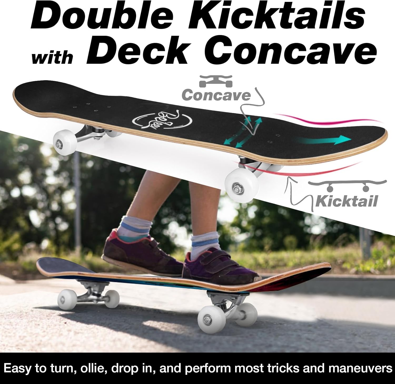 - Stabil & Stark: Das Board ist 10mm dick und besteht aus 7-lagigem kanadischem Ahornholz. Es ist stark und langlebig, um Fahrern bis zu 100Kg standzuhalten. Es ist mit 5 zoll Heavy-duty-aluminiumlegierungs-lkws ausgestattet, die sie zuverlässig und