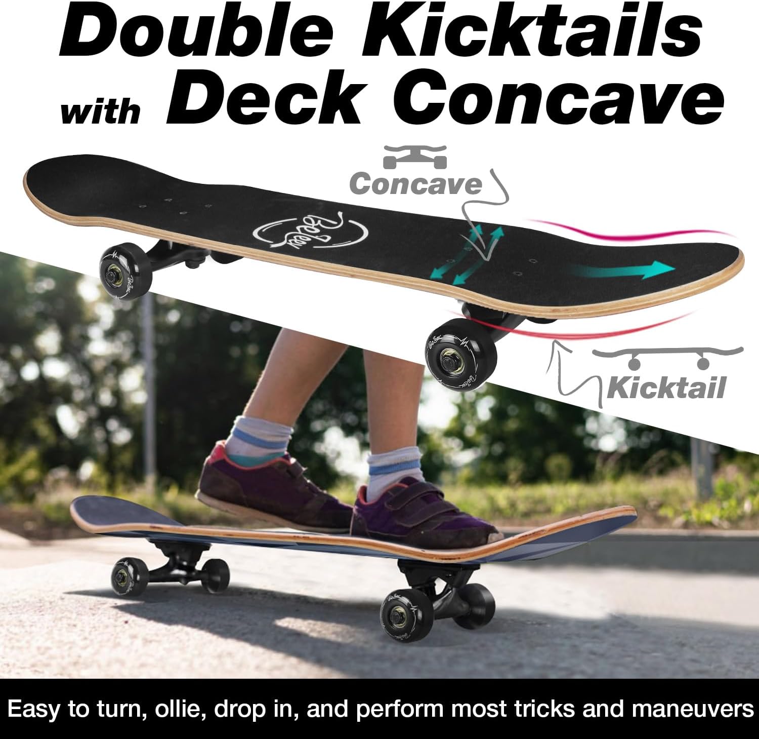 - Stabil & Stark: Das Board ist 10mm dick und besteht aus 7-lagigem kanadischem Ahornholz. Es ist stark und langlebig, um Fahrern bis zu 100Kg standzuhalten. Es ist mit 5 zoll Heavy-duty-aluminiumlegierungs-lkws ausgestattet, die sie zuverlässig und