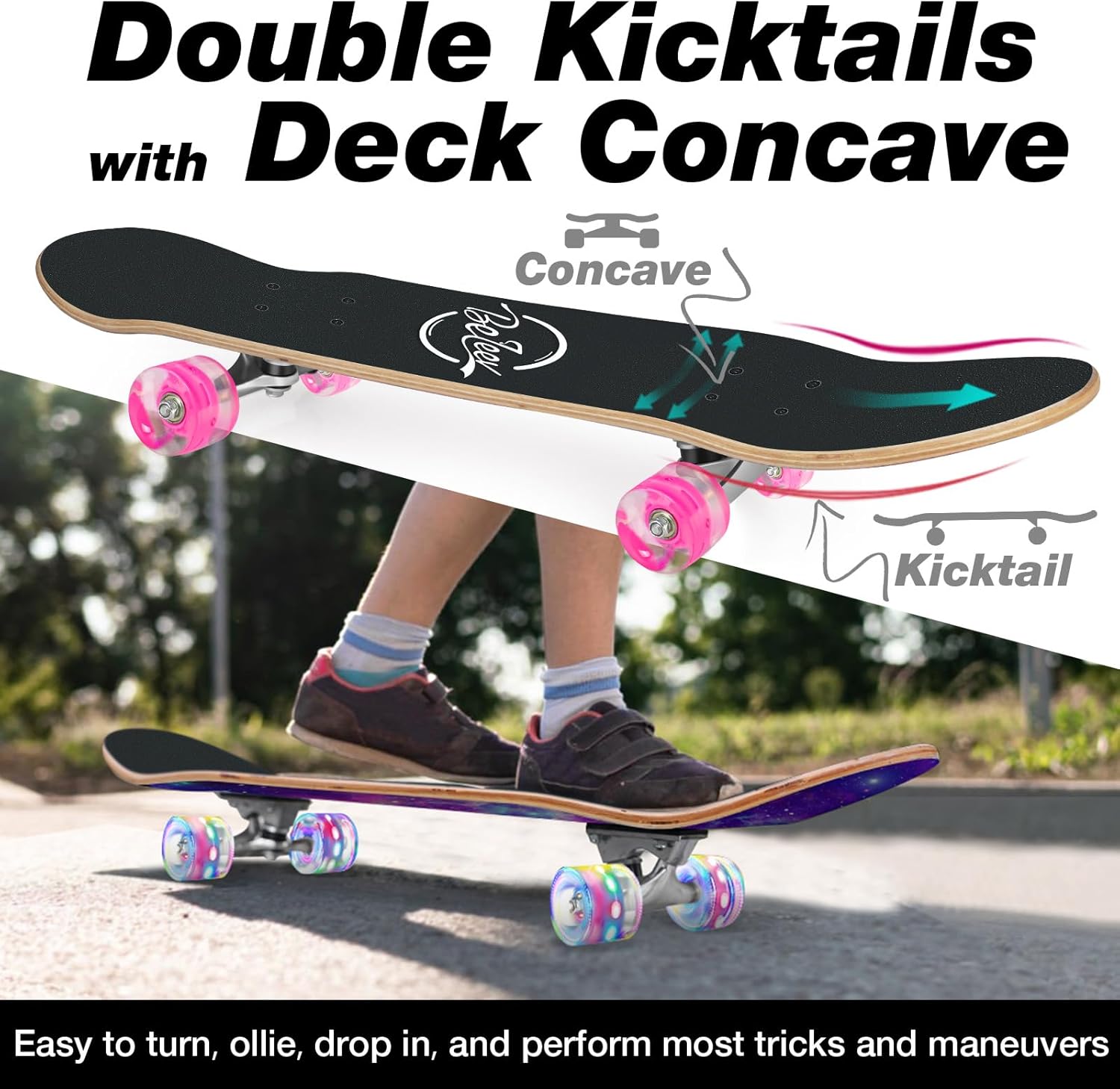 - Einfache Steuerung: Symmetrisches konkaves Design mit doppeltem Tritt für einfacheres Bremsen und mehr Energie von den Fersen bis zu den Zehen. Das wasserdichte, rutschfeste Schmirgelband bietet eine hervorragende Traktion zwischen Ihren Schuhen und dem