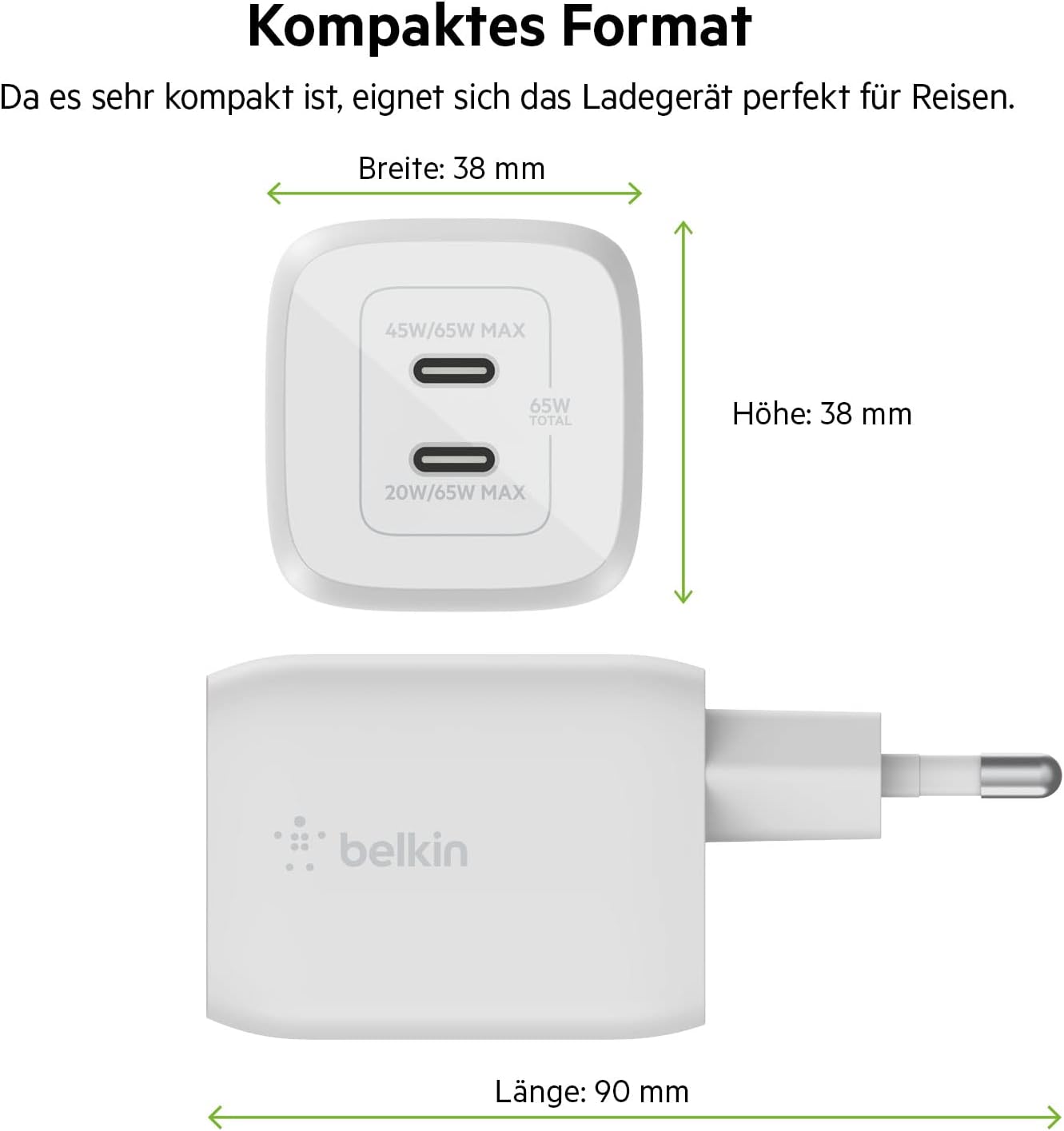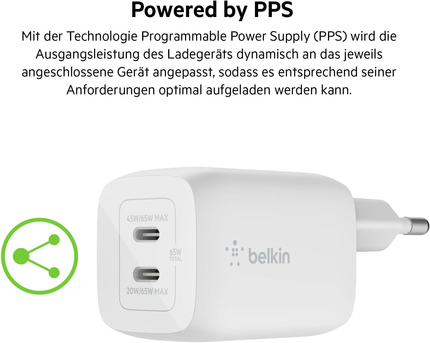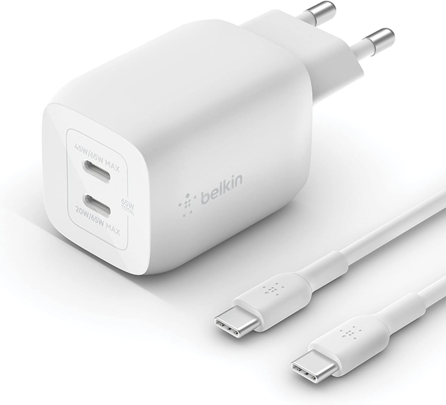 Belkin 65-W-USB-C-Ladegerät mit 2 Ports und USB-C/C-Kabel, Schnellladen mit Power Delivery3.0 und Ga