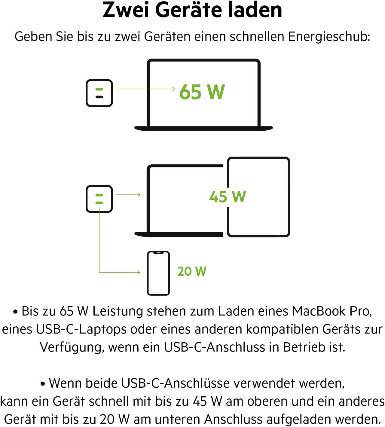 • Profitieren Sie von einer Leistung von bis zu 65 W, wenn Sie nur einen USB-C-Anschluss nutzen und 45 W + 20 W, wenn beide in Betrieb sind