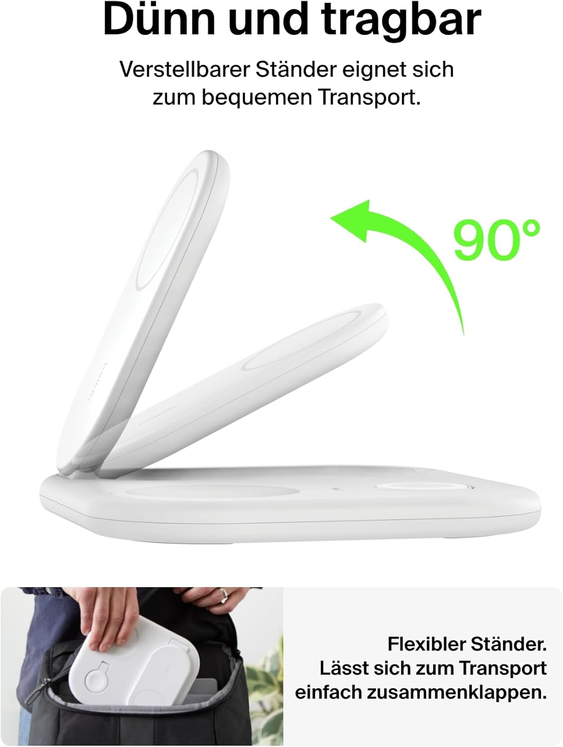 • TRAGBARE iPHONE-LADESTATION MIT EINKLAPPBAREM STÄNDER: Dieses tragbare induktive Ladegerät lässt sich mühelos überall aufstellen und ausrichten, sodass Sie Ihre Geräte zu Hause, in der Arbeit oder im Ferienhotel sicher und zuverlässig laden