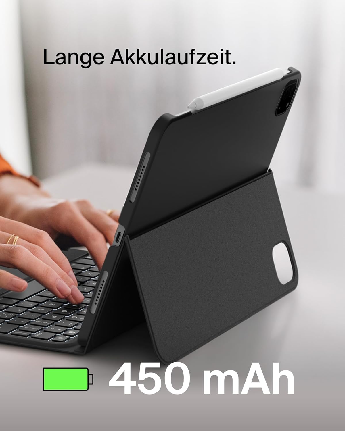 • 450-MAH-LITHIUM-AKKU: Dank des integrierten Akkus brauchen Sie nicht oft zu laden. Die Akkulaufzeit der Tastatur ist unabhängig vom verbundenen iPad, was bedeutet, dass Ihre Tastatur nicht schnell entladen ist.