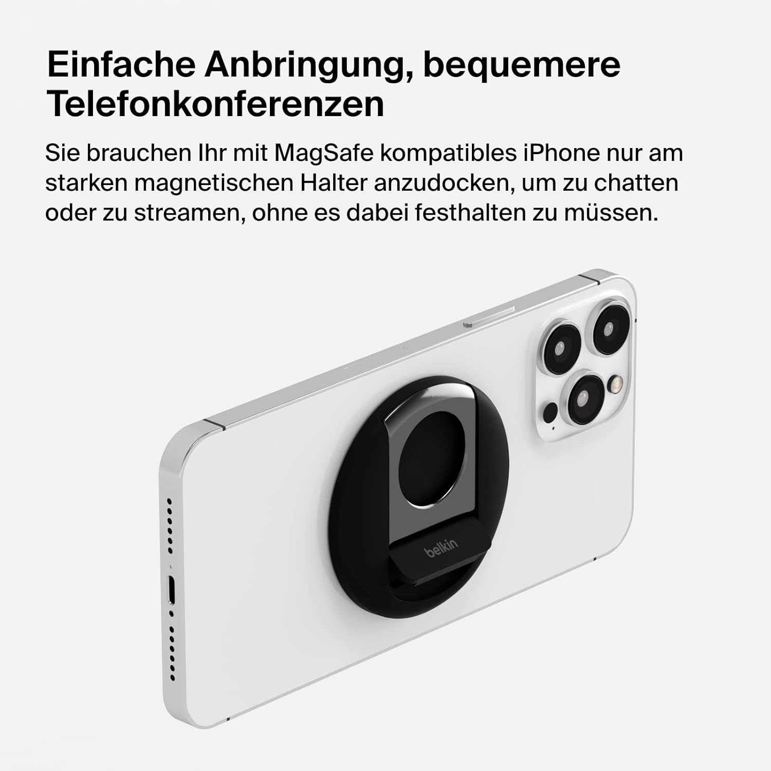 - Sie können Ihr iPhone sicher befestigen. Der mit MagSafe kompatible Halter ermöglicht sicheres, zuverlässiges Streamen oder Chatten, ohne dass Sie Ihr Gerät dabei festhalten müssen.