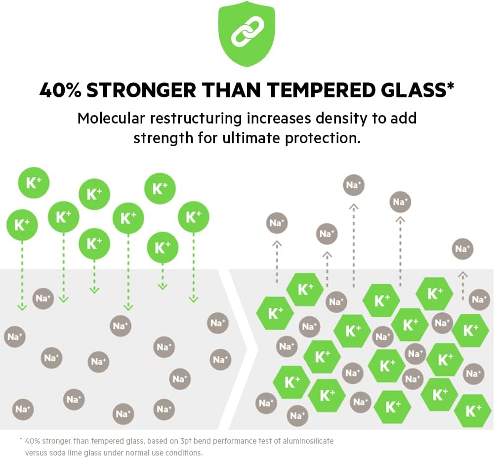 • Durch das spezielle Herstellungsverfahren, das auf dem Austausch von Ionen basiert, bis zu 40 % stärker als herkömmliches Hartglas