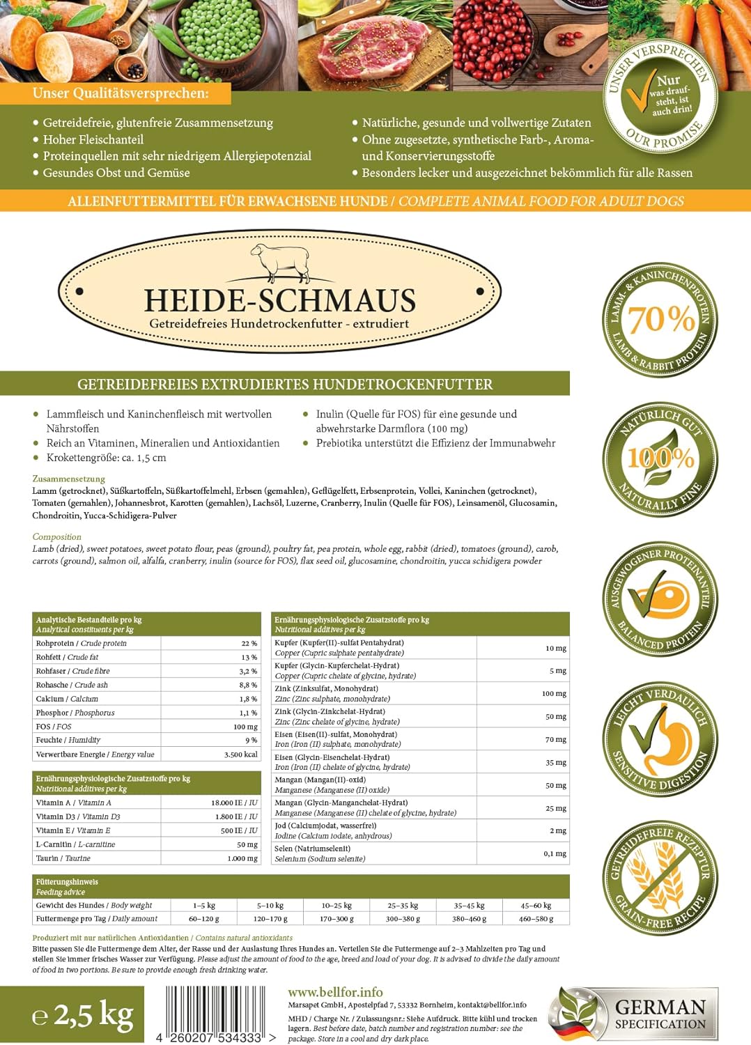 - Bellfor Heide-Schmaus Weidelamm & Wildkaninchen Getreidefreies Frei von künstlichen Farb- und Geschmackstoffen Enthält natürliche Antioxidantien
