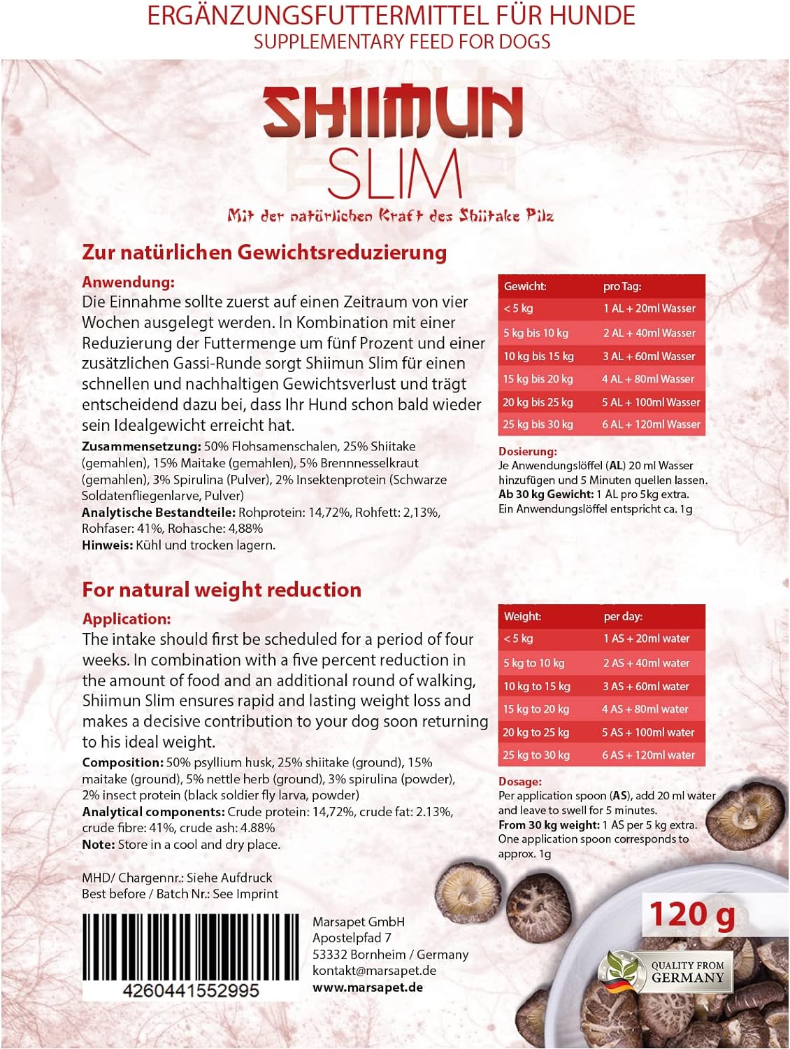 - Die in Shiimun Slim enthaltenen Spirulina zeichnen sich durch ihren hohen Eiweissgehalt aus und helfen dadurch mit einer stark sättigenden Wirkung dabei Heisshungerattacken bei Ihrem Hund zu vermeiden