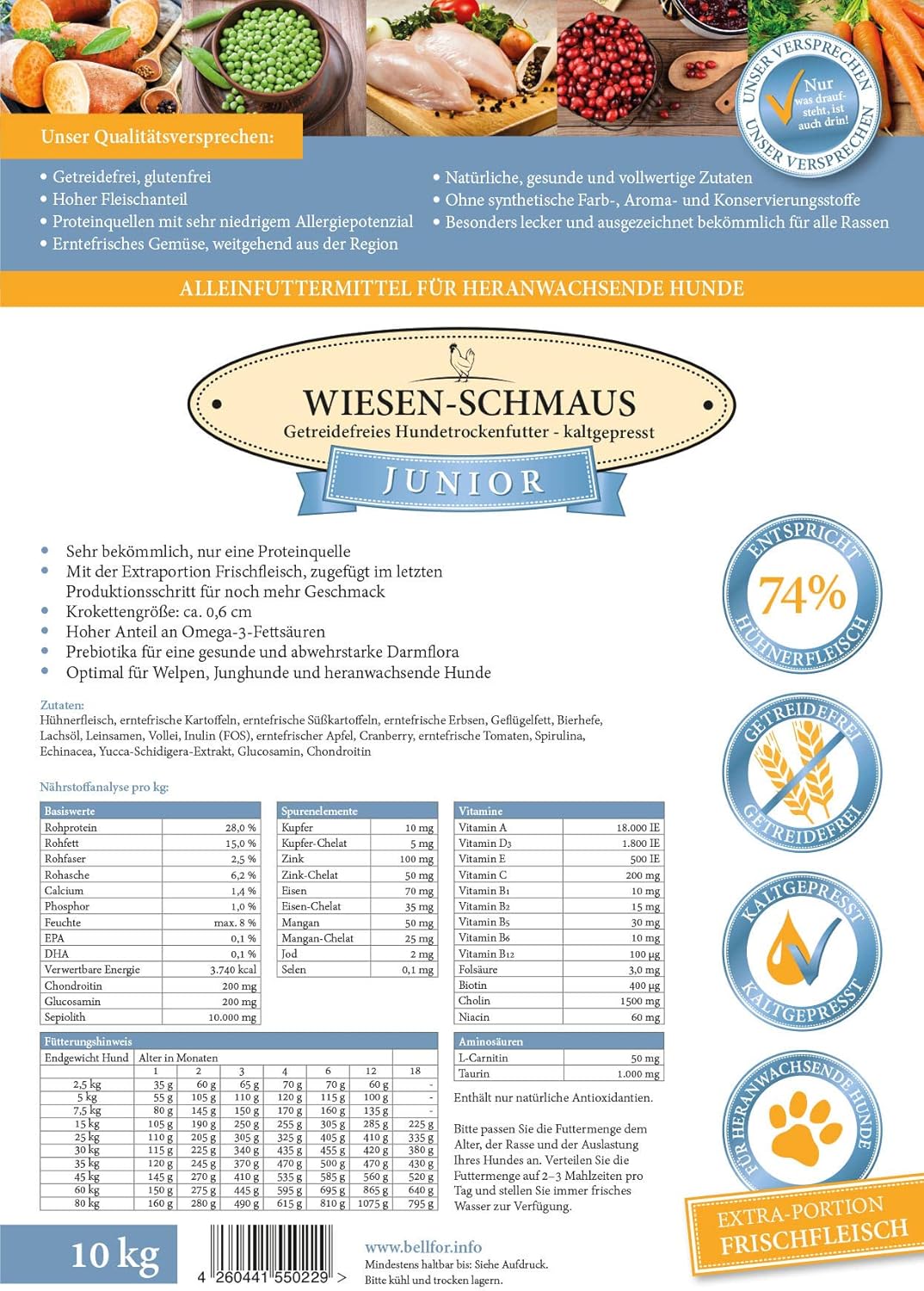 • Bellfor Wiesen-Schmaus Junior kaltgepresst trockenfutter mit huhn getreidefrei für welpen, junghunde und heranwachsende hund sowie trächtige