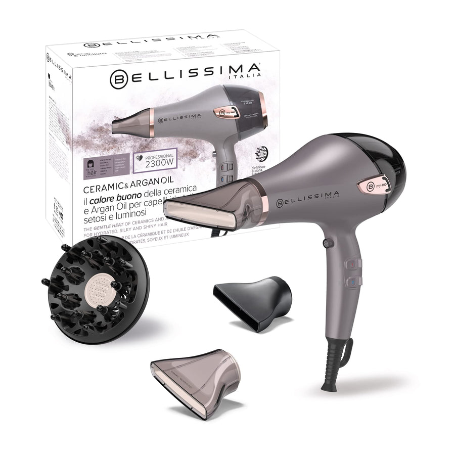 - Keramiktechnologie und Arganöl: Die gute Wärme, die das Haar respektiert und schützt, wird durch den Luftstrom erzeugt, der mit den drei Keramikkomponenten des Haartrockners in Kontakt kommt; Keramik gibt von Natur aus beim Erhitzen gute