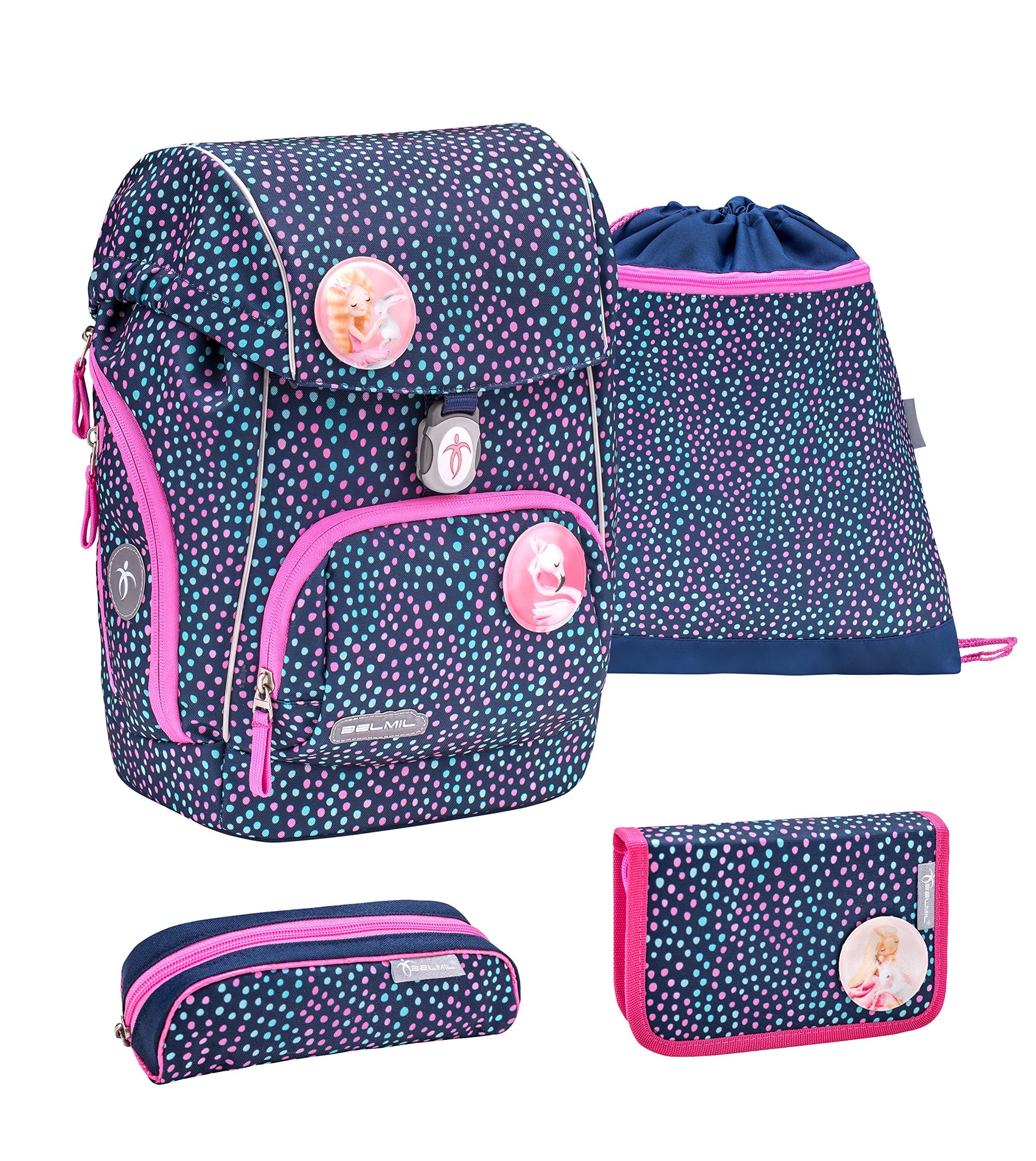 PRODUKTBESCHREIBUNGEN Der Comfy von Belmil ist eine ergonomische Schultasche, die optimal für Kinder zwischen 6 und 10 Jahren geeignet ist. Leichtes und wasserabweisendes Polyestermaterial, Seitenverstärkungen und eine stabile Bodenwanne machen den Ranzen ausgesprochen langlebig und strapazierfähig. So lässt er sich bequem tragen und macht dabei locker alle Belastungen des Schulalltags mit. Die ergonomische Form und die atmungsaktive Rückenpolsterung minimiert die Belastung des Rückens. Die S-förmigen und verstellbaren Schultergurte ermöglichen einen hohen Komfort und reduzieren die Belastung der Schultern. Der Schulranzen beinhaltet drei separate Innenfächer, welche den Kindern ein leichtes Ordnen der Schulutensilien gewährt. Durch die reflektierenden Elemente an allen Seiten des Schulranzens, ist Ihr Kind auch im Dunkeln sicher unterwegs. Und das Beste am Comfy - er ist "Geprüft & empfohlen" vom Verband AGR "Aktion Gesunder Rücken" 25 Jahre AGR-Gütesiegel: glaubwürdig, unabhängig und transparent - Serie: Comfy - Typ: Schulranzen - Material: wasserdichtes Polyester - Hauptfach mit drei Innenfächern - Stundenplanfenster - Reissverschlussfach im Deckel - Frontfach (erweiterbar) - Zwei Seitentaschen mit Reissverschluss - Magnetschloss - Gepolsterte Schultergurte (verstellbar) - Brustgurt - Abnehmbare Hüftgurte - Ergonomisches Rückenpolster (atmungsaktiv, höhenverstellbar) - Verstärkter Tragegriff und Aufhängeschlaufe - Standfester Boden - Turnbeutel (aufsteckbar auf Ranzen) - Schlamperetui mit Reissverschluss - Federmäppchen (ungefüllt) - Reflektierende Elemente - Reflektierender Schlüsselanhänger - Drei Klettverschluss Patches - Breite x Höhe x Tiefe: 27 cm x 36 cm x 19 cm - Volumen: 16 L - Gewicht: 1,0 kg