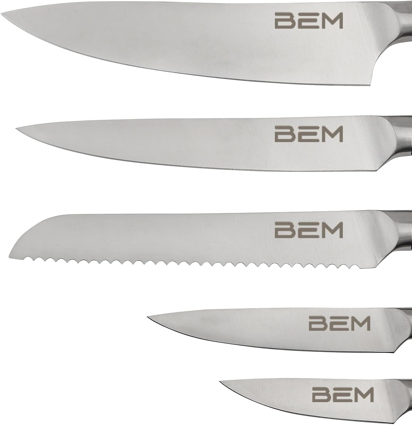 - ✅ Set besteht aus: Gemüsemesser: 3,5" x 2,0 mm / 20,5x3x1,7 cm / 87,5 g; Universalmesser:5" x 2.0 mm / 24x3x1,7 cm / 96 g; Aufschnittmesser:8" x 2.5 mm / 33x3.5x2 cm / 177 g; Chefkochmesser: 8" x 2.5 mm / 33x4.5x2 cm / 208 g; Brotmesser: 8" x 2.5