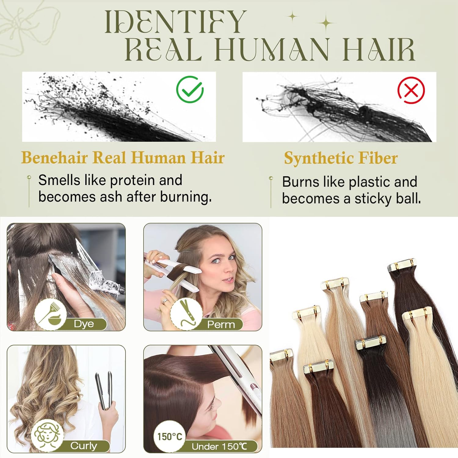 - đ©ăTape in Echthaar Extensionsă: Benehair echtes haare sind aus 100 % menschliches haar hergestellt,seidig, weich und frei von Verwicklungen. Eine Vielzahl beliebter Farben und Grössen passt perfekt zu Ihrem Haar und eignet sich fĂŒr die Teilnahme