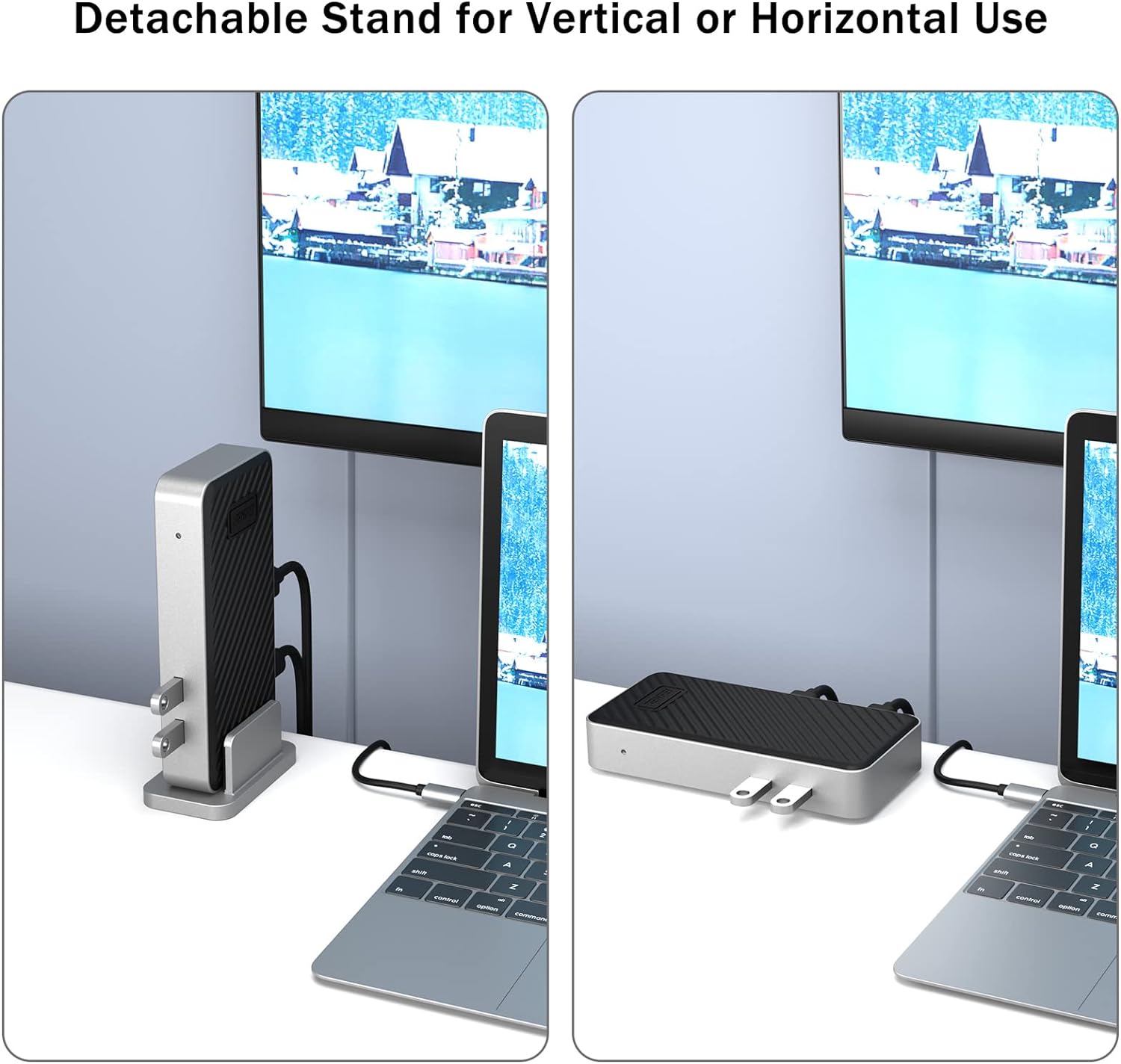 - Lieferumfang: 1 Dockingstation; 1 Wechselstromadapter, die Dockingstation benötigt die externe Stromzufuhr von diesem Wechselstromadapter; 1 USB-Kabel (A nach B, 1,5 Meter) und 1 USB-A-zu-C-Adapter, die einzige Verbindung vom Laptop zur Dockingstation;