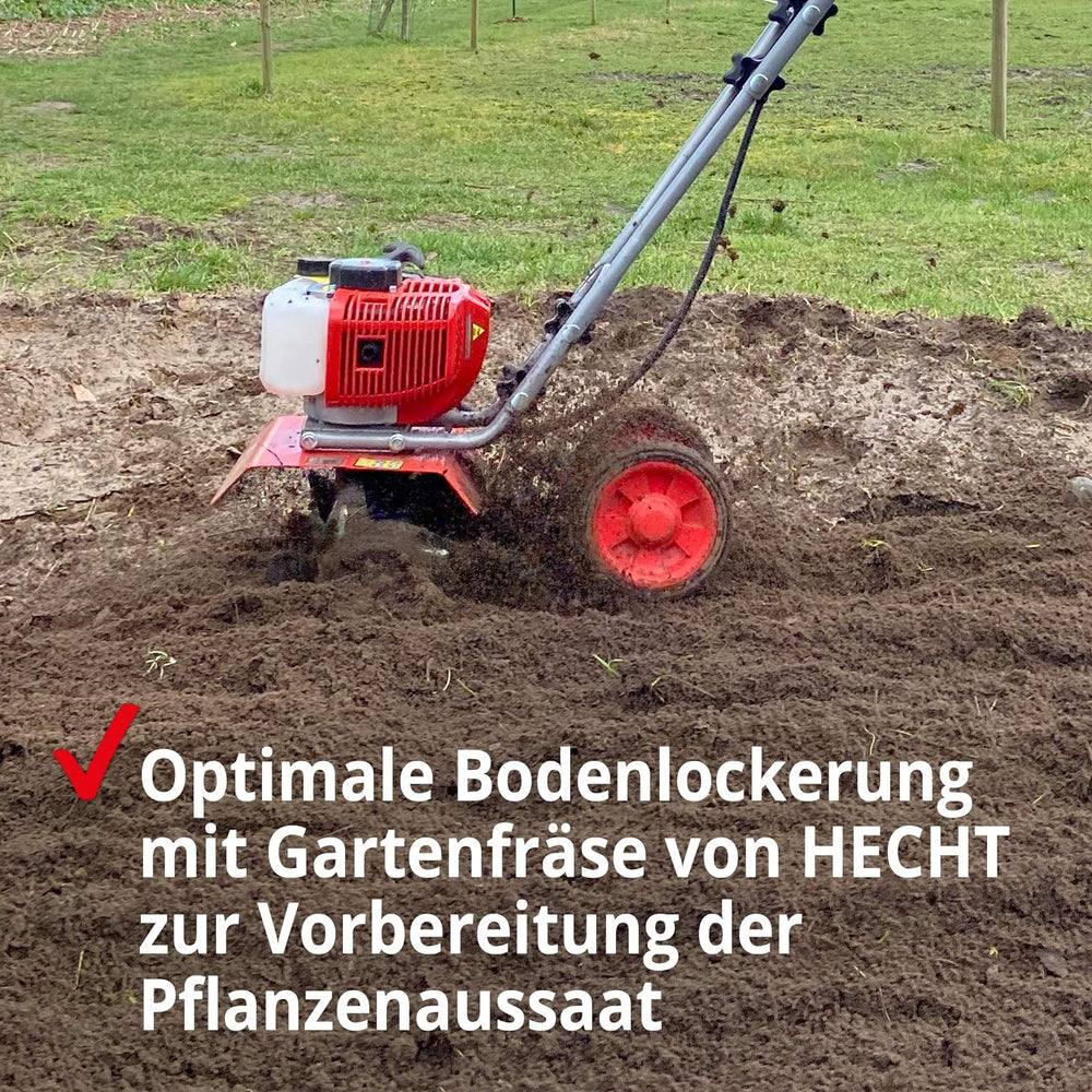 - KRAFTVOLLER 2-TAKT MOTOR – Mit kraftvollem 2 PS/1,5 kW Motor lockert die Hecht Fräse Ihren Boden perfekt auf. Ihre Freude wird gross sein, die anstrengende Arbeit mit dem Spaten ist nicht mehr nötig