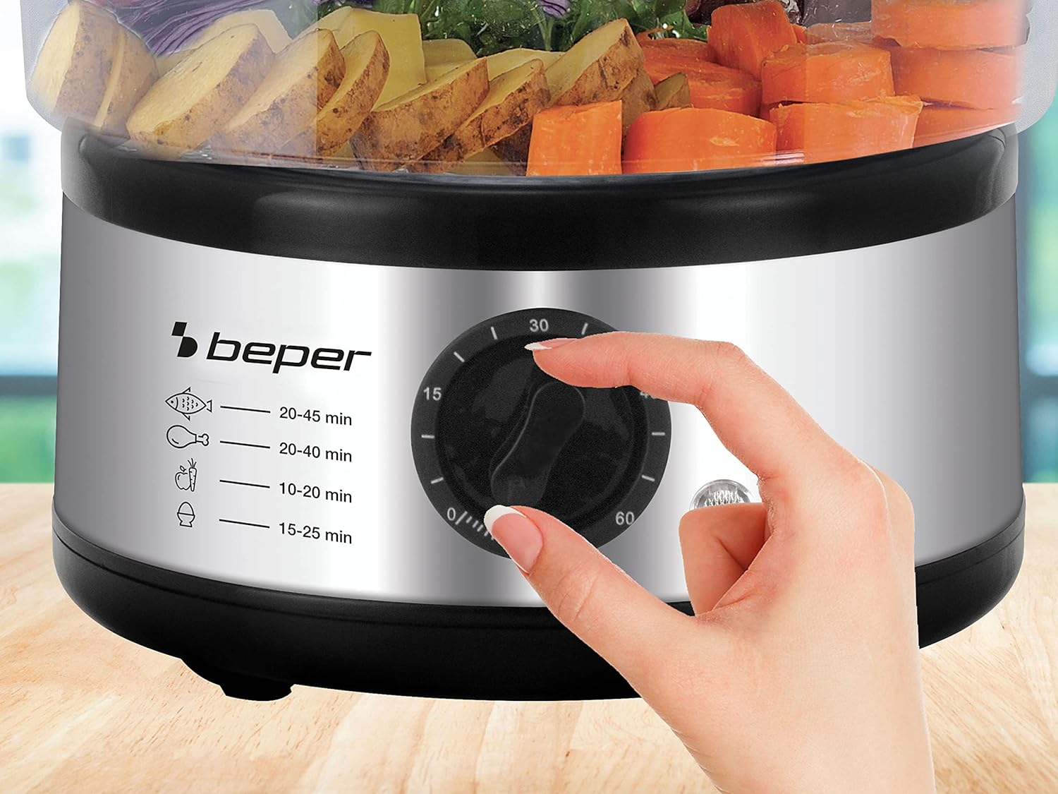 - TIMER UND ARBEITSLICHT: Mit dem 60-Minuten-Timer können Sie die gewünschte Garzeit einstellen und den Dampfgarer automatisch ausschalten