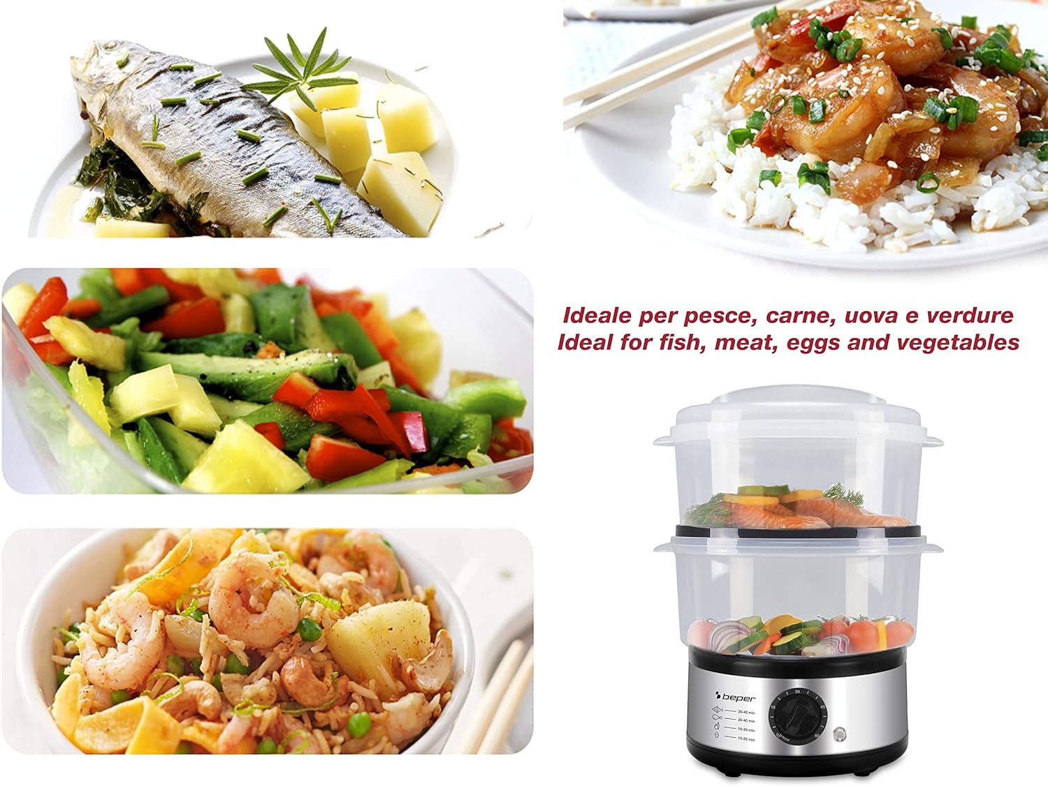 - DAMPFGAREN: Der Dampfgarer ist mit zwei transparenten Behältern von jeweils 2,5 Litern ausgestattet, mit denen verschiedene Gerichte gleichzeitig gedämpft werden können, wobei die Nährstoffe und Mineralien erhalten bleiben