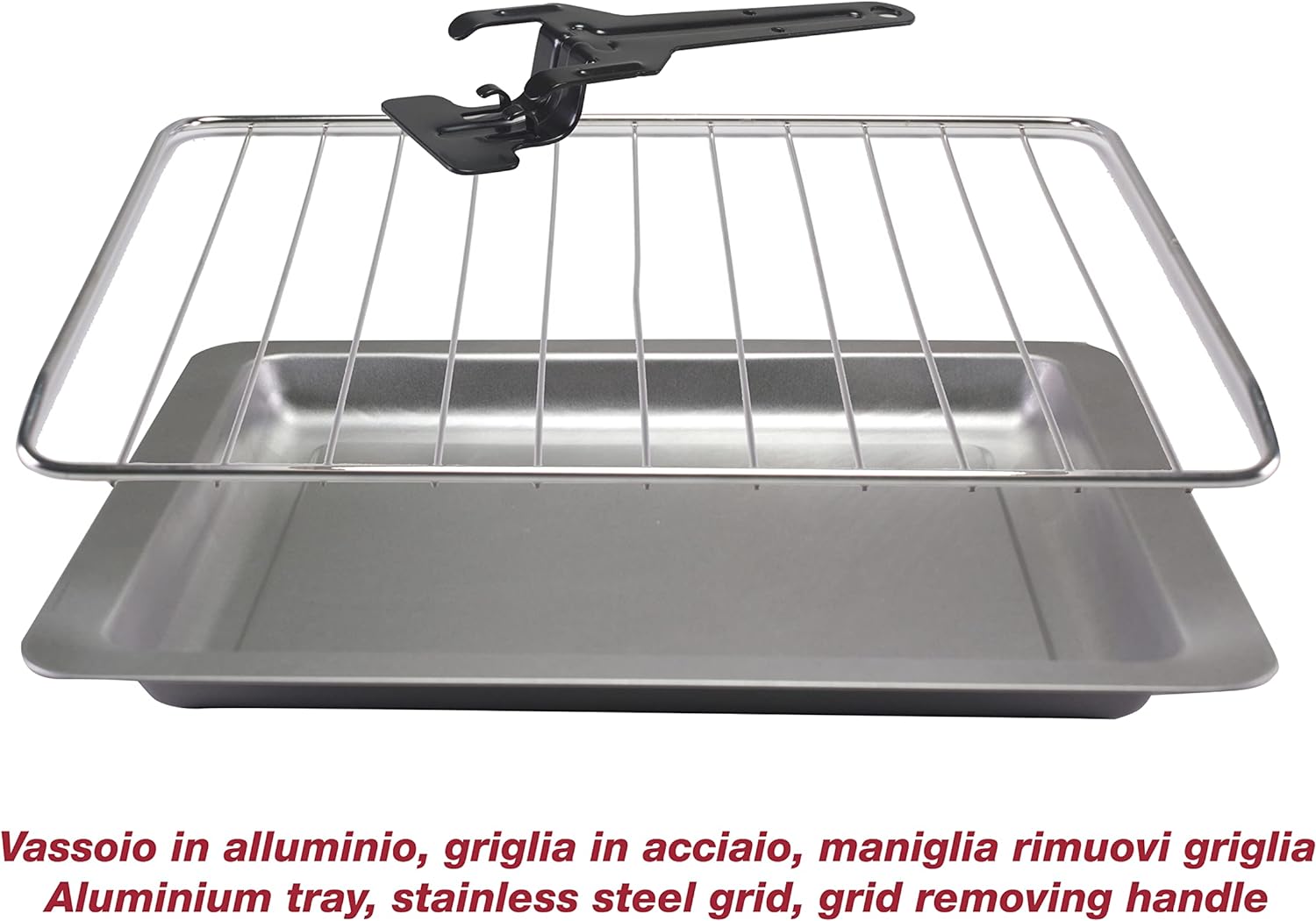 - SICHER: Nach 60 Minuten schaltet sich der Backofen automatisch ab, damit unser Geschirr nicht anbrennt. Am Ende der Vorbereitung können wir mit der Reinigung der verschiedenen Teile fortfahren, indem wir den Grill mit einem mitgelieferten Griff entfernen und die Aluminiumschale herausziehen.