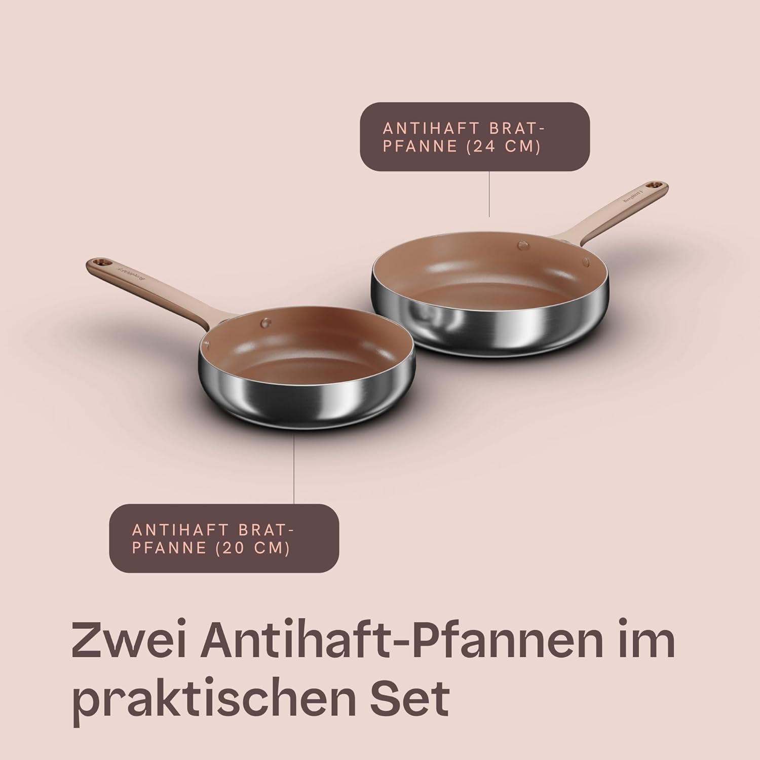 - 2-teiliges Roségold Pfannen Set: Bestehend aus einer 20cm Pfanne (1,5L) & einer 24cm Pfanne (2,3L) – für Induktionsherd, Ceran, Gas & mehr.