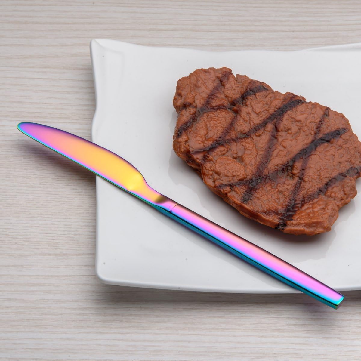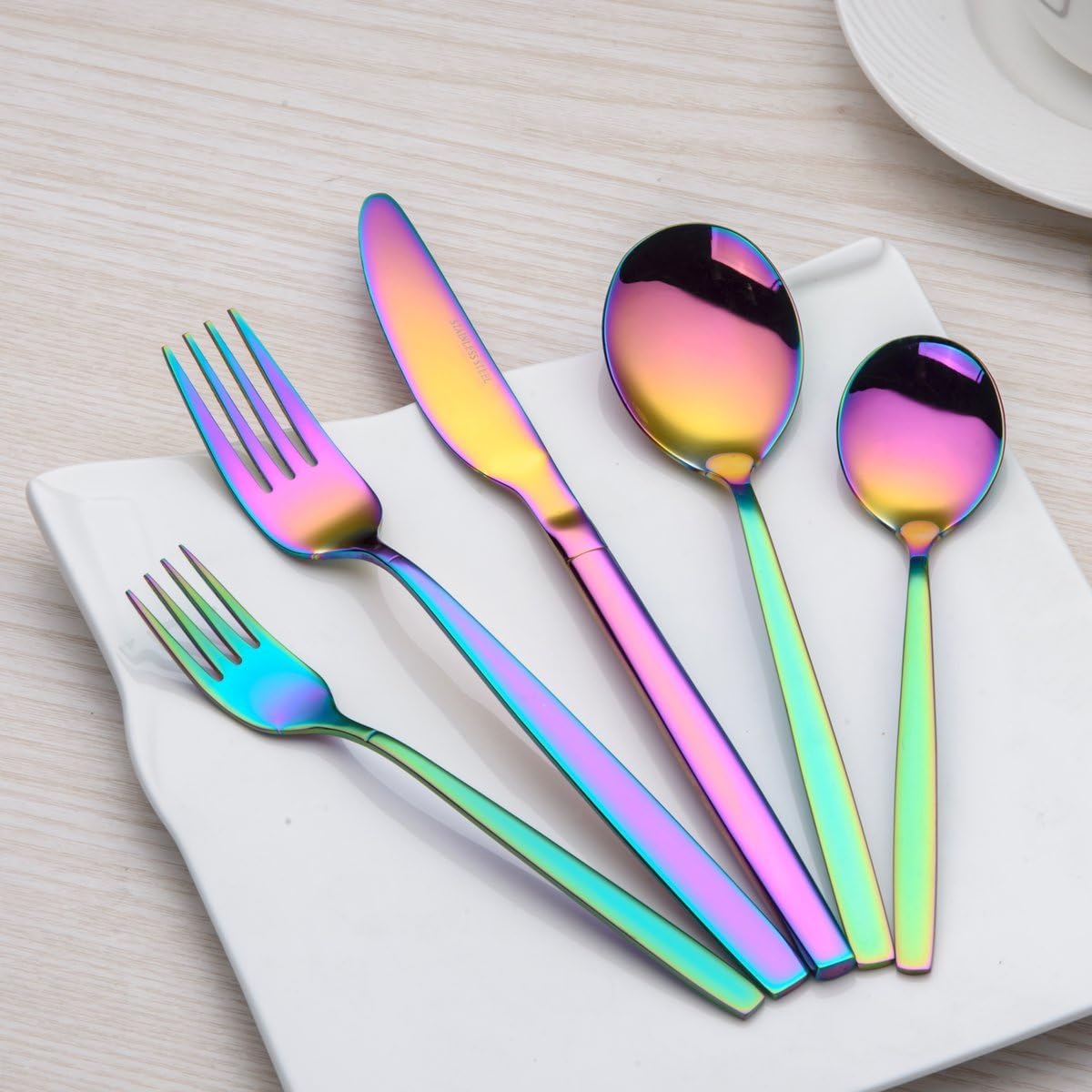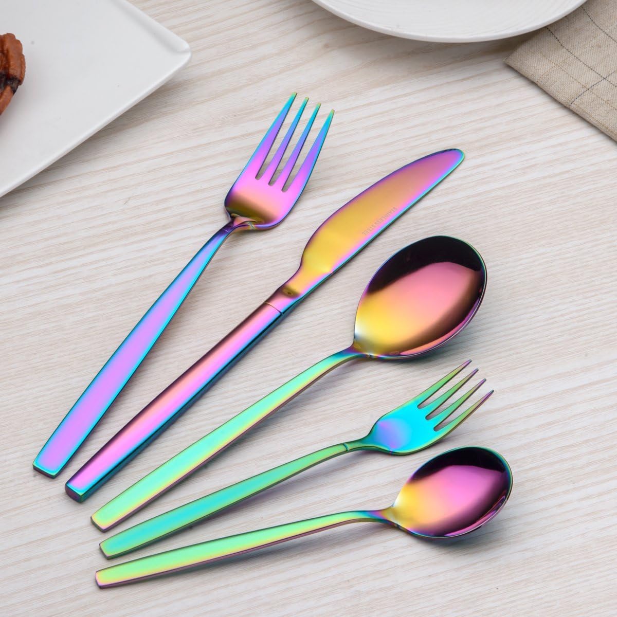• Hochwertiges Titan-Regenbogen-Farben-Hochtemperatur-Vakuum überzogen, es erhöhte Oberflächenhärte, vermeiden Sie das Scratch auf dem Besteck beim Verwenden. Vervollkommnen Sie für täglichen Gebrauch, Feiertagsabendessen, Party, Hochzeit,