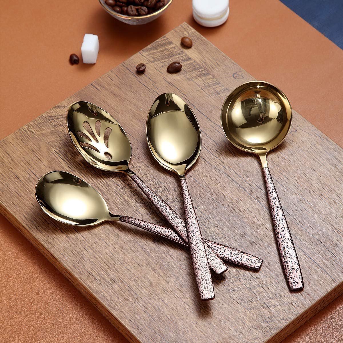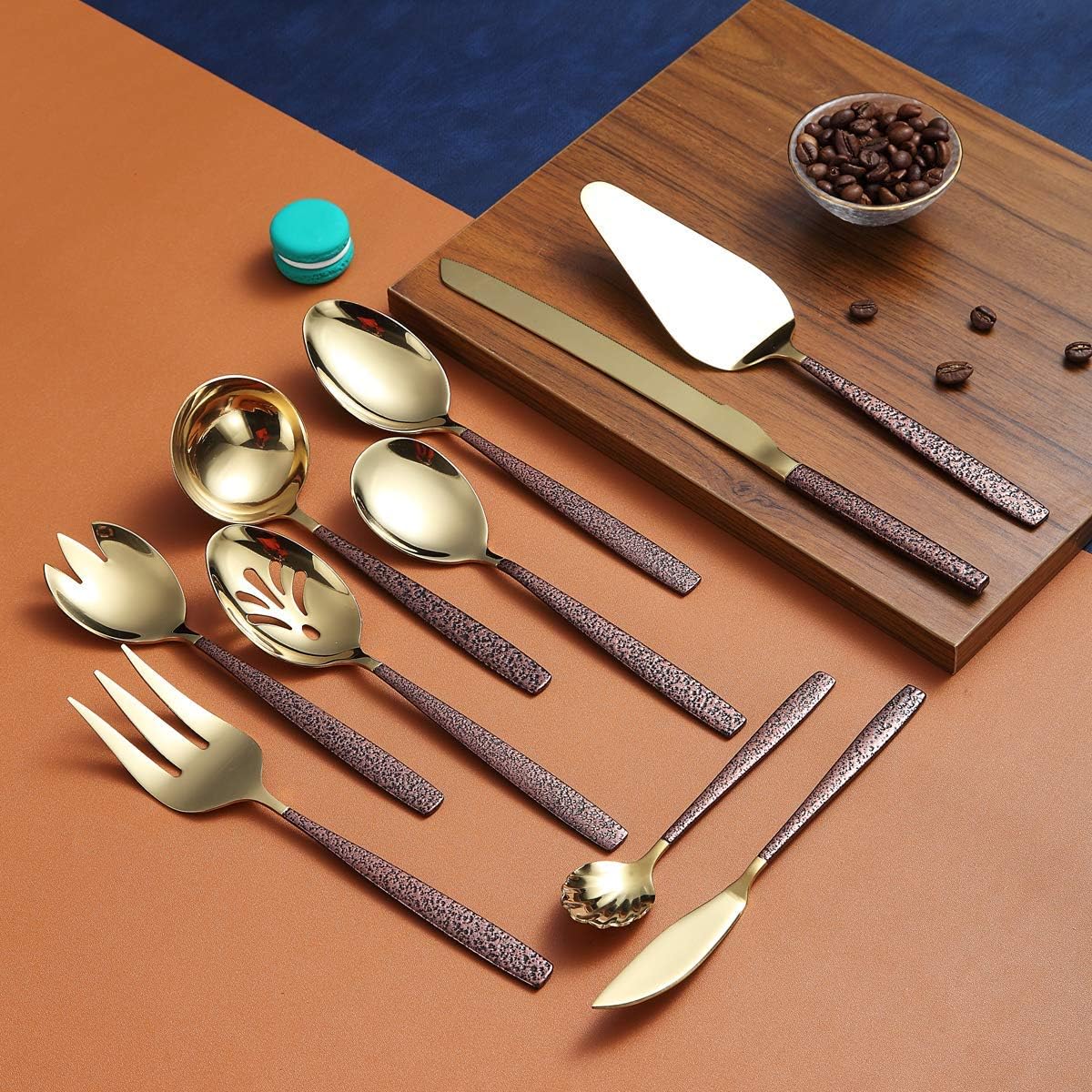 - 10 teiliger Mondoberflächengriff Glänzendes Goldkopf-Besteck-Servierset, einschliesslich: 1 Servierlöffel, 1 geschlitzter Servierlöffel, 1 Serviergabel, 1 Zuckerlöffel, 1 Kuchenserver, 1 Buttermesser, 1 Kuchenmesser, 1 Sossenkelle, 1 Salatlöffel, 1