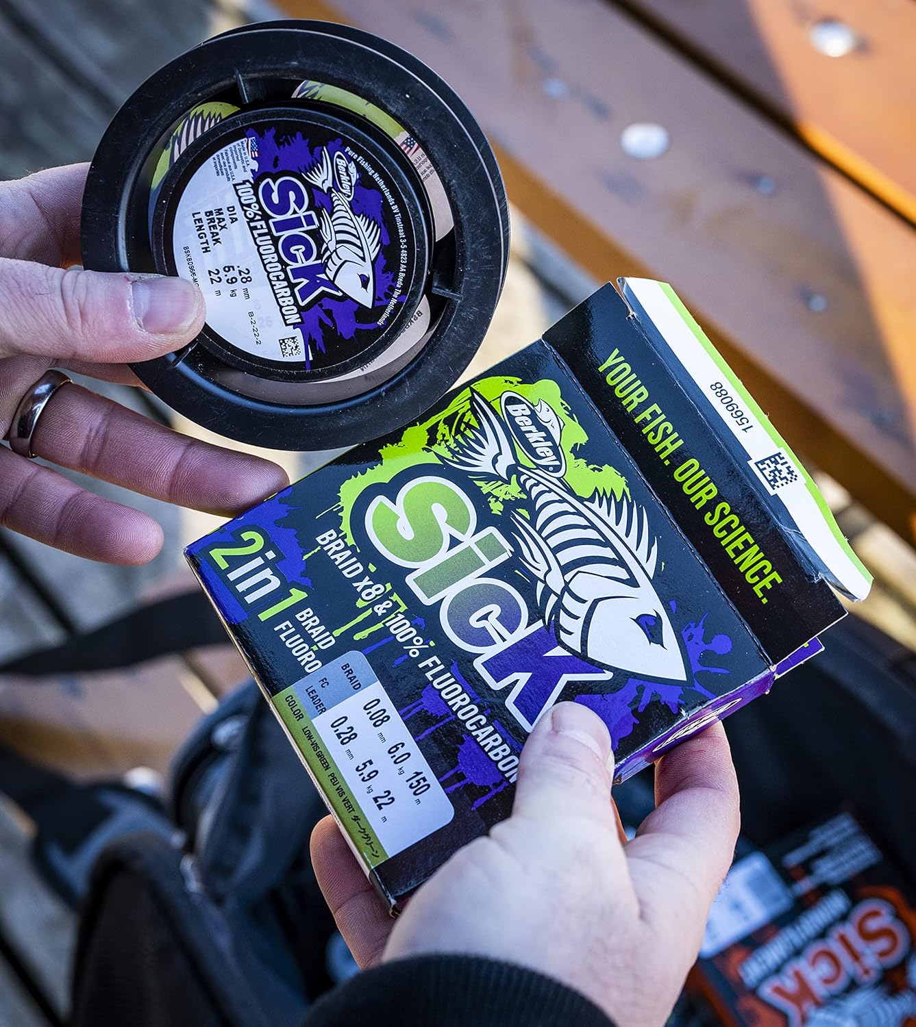 - Innovatives Duo-Spulen-in-Spulensystem – Entworfen, um die kleine Spule des Sick Fluorocarbon Vorfachmaterials einfach in die grössere Spule des 8-Träger-Multifilament-PE Braids zu fixieren, was ideal für den einfachen Transport ist und die beiden