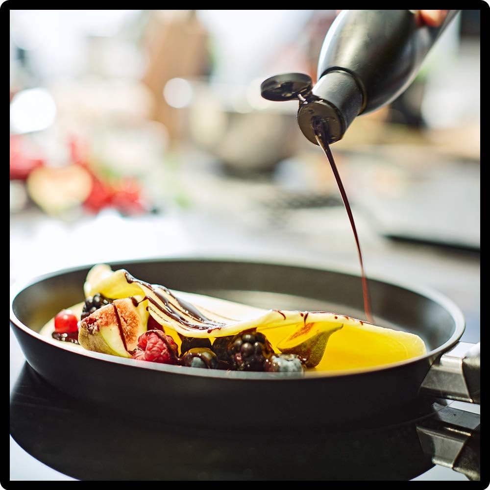 - FLACH – Müheloses Wenden von Crepes, Pfannkuchen oder Omelette gelingt dank des extra flachen Randes. So wird die Zubereitung kinderleicht.