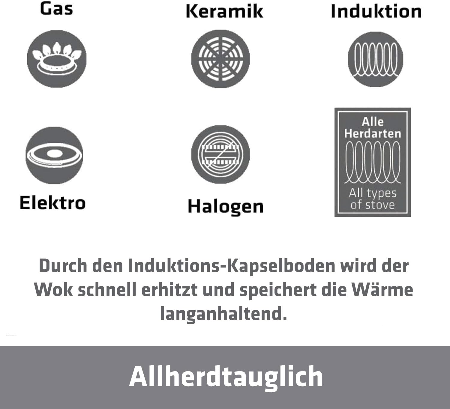 - INDUKTIONSGEEIGNET – Die Wokpfanne ist für Indukionsherde geeignet und kann genauso auf herkömmlichen Herden verwendet werden – Gas, Halogen, Elektro, Glaskeramik.