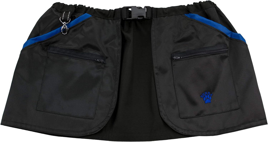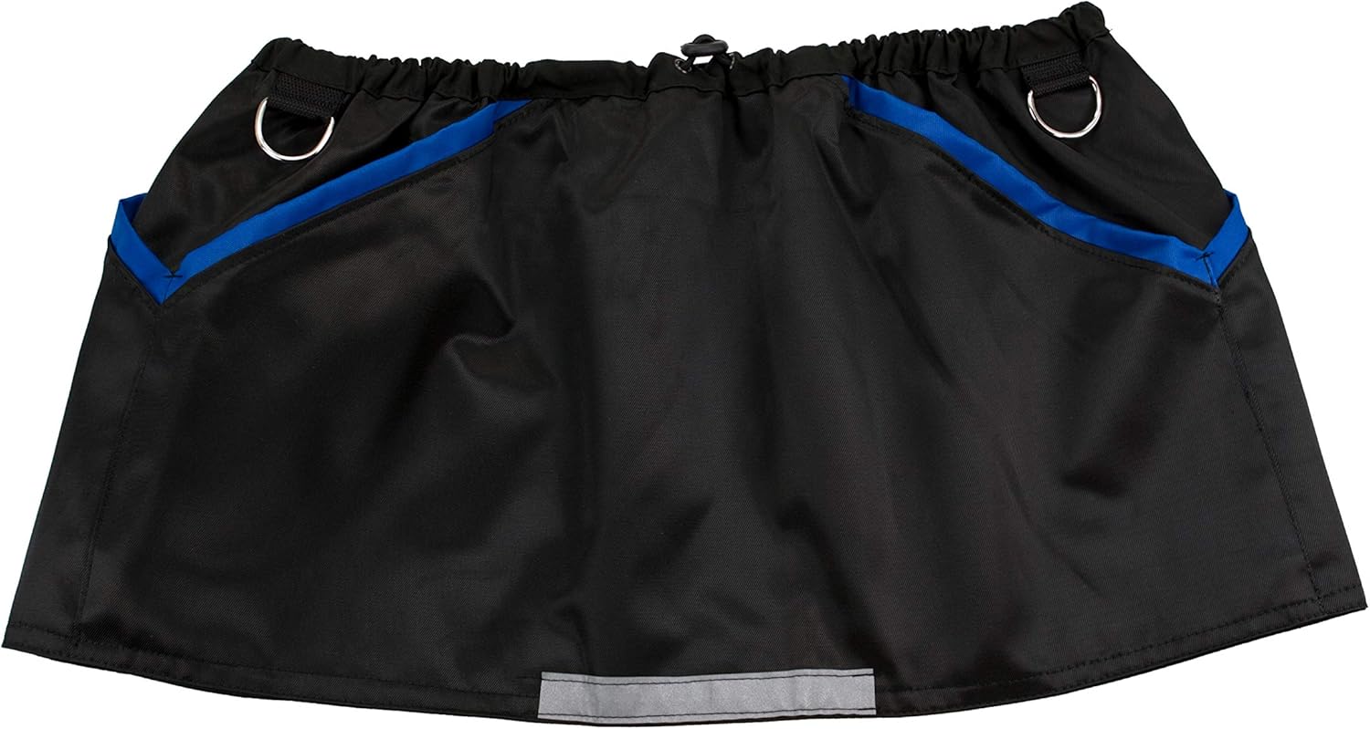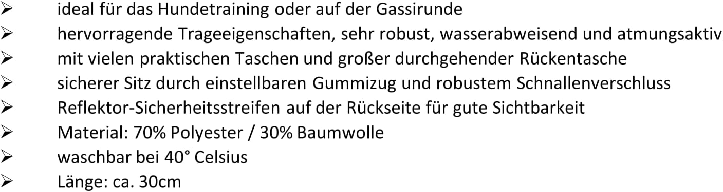 PRODUKTBESCHREIBUNGEN "Berra" Trainingsgürtel / Trainingsrock / "halbe Weste", ideal für`s Hundetraining oder auf der Gassirunde, sicherer Sitz durch Gummizug im Taille-/Hüftbereich, am Rücken zusätzlich durch einen Stopper einstellbar, insgesamt 5 Taschen, davon im Vorderbereich 2 grosse Einschubtaschen + 2 kleine Taschen mit Reissverschluss, hinten eine grosse durchgehende Tasche mit beidseitigem Eingriff, ideal für Hundespielzeug, Dummys, etc., beidseitig jeweils Ringe und an der rechten Vorderseite, ein Karabiner zur Befestigung von Hundpfeife, Clicker, etc., robuster Schnallenverschluss, Reflektor-Sicherheitsstreifen auf der Rückseite, Material: 70% Polyester / 30% Baumwolle, waschbar bei 40 Grad, Länge: ca. 30cm, Farbe: schwarz, Grössen: XS = 100cm (Konfektionsgrösse 34/36) S = 108cm (Konfektionsgrösse 38/40) M = 116cm (Konfektionsgrösse 42/44) L = 124cm (Konfektionsgrösse 46/48) XL = 130cm (Konfektionsgrösse 50/52), Die Konfektiongrössen sind grobe Richtwerte. Am besten Sie messen die stärkste Stelle an Hüfte/Po und rechnen ca. 10 cm hinzu. (Beispiel: Sie messen 104cm + 10cm = 114cm, dann brauchen Sie die Gr. M) Clicker, Dummy und Hund gehören nicht zu diesem Angebot!