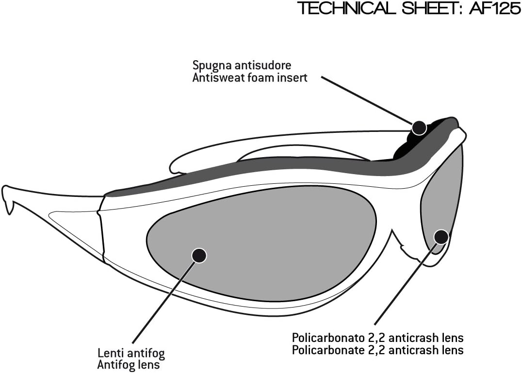 - Robuste Polycarbonatgläser 2.2 mm. Antibeschlag, schützen die Augen vor Verletzungen. - 100% UV-Schutz. Linsen sind optisch dezentriert, um Verzerrungen zu beseitigen und Vergrösserung zu verhindern.