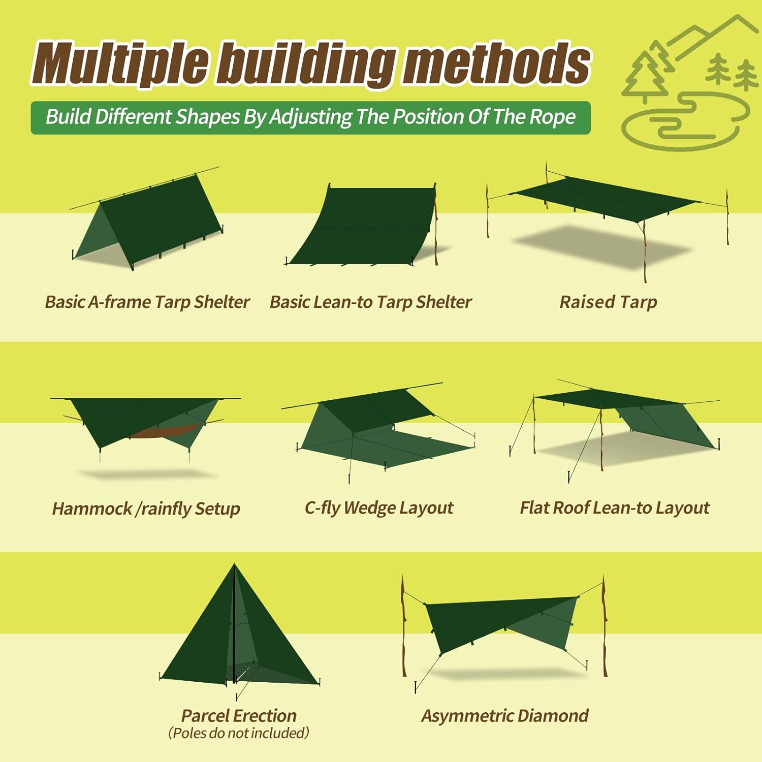 - 【LIEFERINHALT】- Wir liefern ein komplettes Set, sodass Sie nichts weiteres kaufen müssen! 1 Zeltplane mit 15 Ösen, 8 verstellbare 210T Ripstop-Nylon Seilen, 6 rostfreie Aluminium Erdnägel, 1 ultraleichte Tragetasche für alles plus ein super