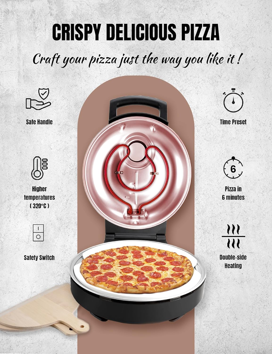 • Inklusive 2x Pizzaschieber aus Holz zum mühelosen herausnehmen ohne Verbrennen, stufenlos verstellbares Thermostat