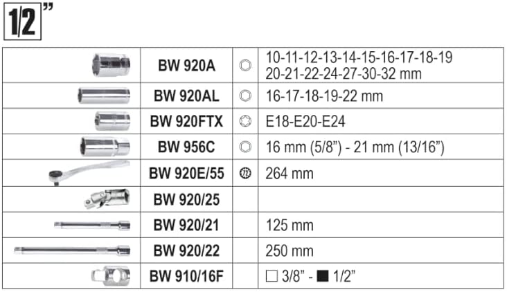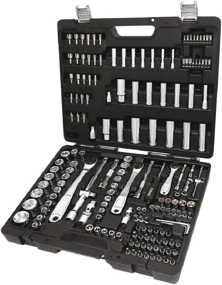 - Das Werkzeugkoffersortiment umfasst: Schraubenschlüssel- und Steckschlüsselsätze mit 3/8"-Nuss, 1/4"-Nuss, 1/2"-Nuss und diversem Zubehör