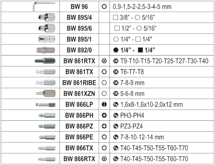 - Koffer enthält 74 Innensechskantschlüssel, 42 Schraubendreherbits, 7 gebogene Aussensechskantschlüssel und 17 Zubehörteile, im Kunststoffkoffer